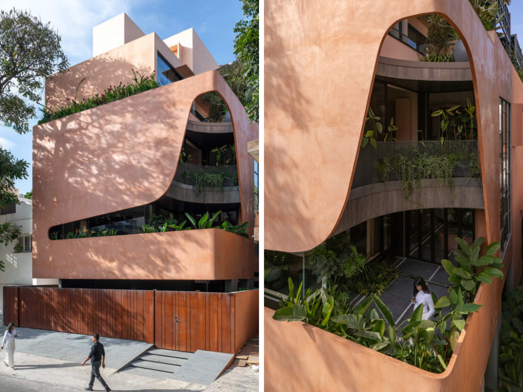 The facade, light and fluid in its articulation, folds and curves to create a play of depth and shadow. This design move not only defines the building’s unique identity within its urban Organic Design context but also carves out a void with a garden in it. This suspended green intervention blurs the boundaries between architecture and landscape, transforming the building into a living organism that breathes with its surroundings.