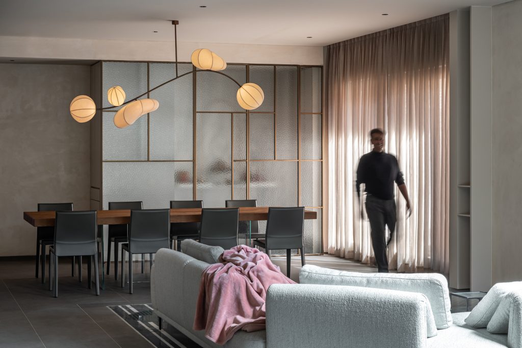 Inside, spaces are organized to maximize fluidity, creating seamless transitions between living, dining, and private zones. Large openings frame views of the gardens, ensuring that natural light filters in throughout the day.