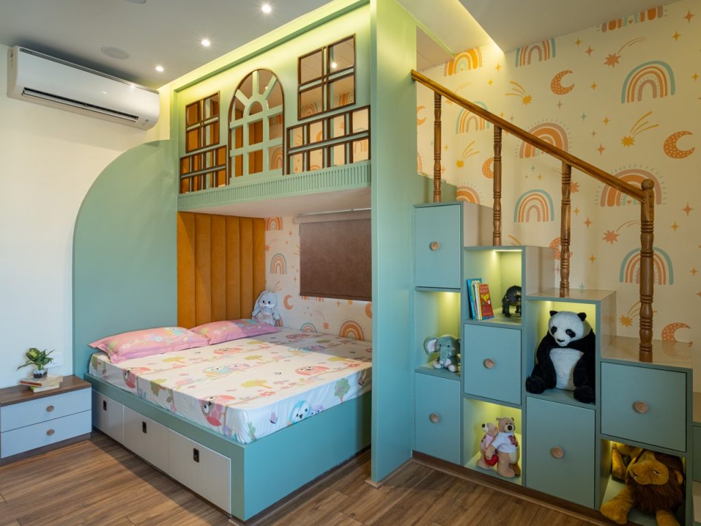 This modern bunk bed setup seamlessly integrates with a neural-shaded inverted arch wardrobe, creating a visually striking yet functional bedroom design. The concept blends sleek architectural curves with smart storage solutions, catering to both aesthetics and efficiency in compact living spaces.