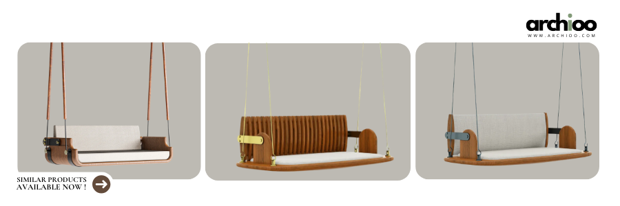 An upholstered bench creates a soft divide between two seating areas—one anchored by sofas, the other by a wooden swing – adding nostalgia, charm and movement to the space.