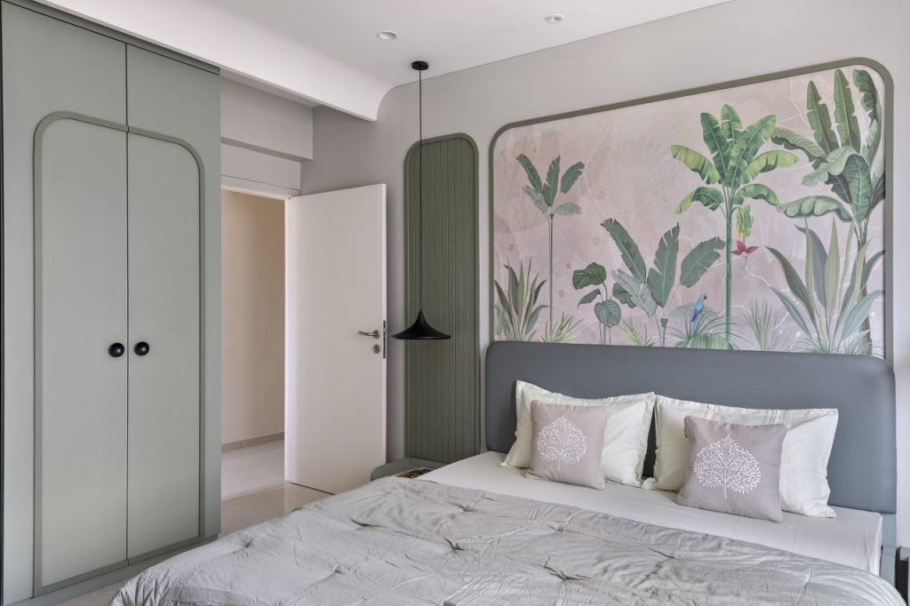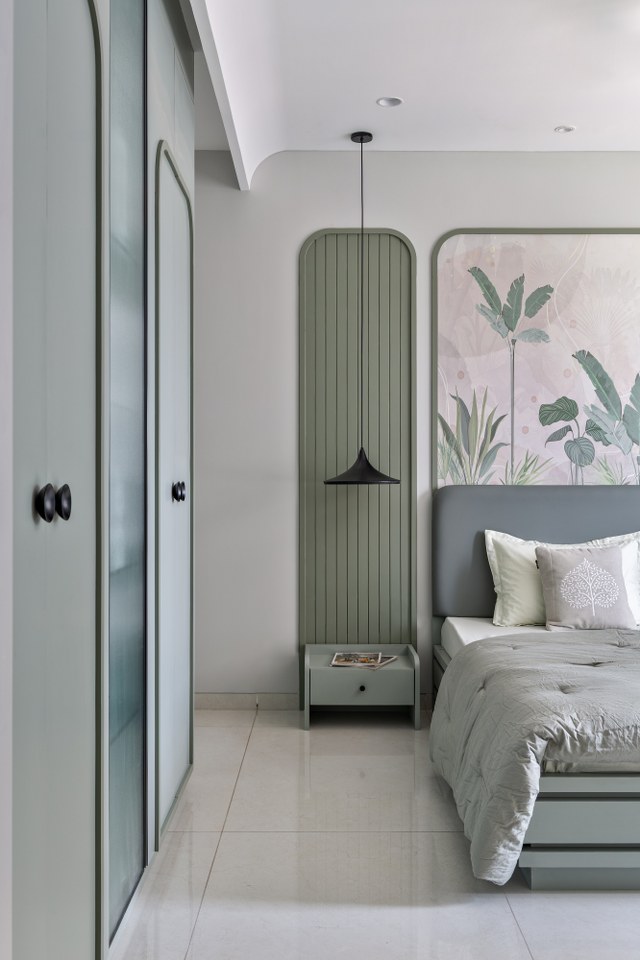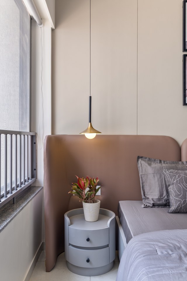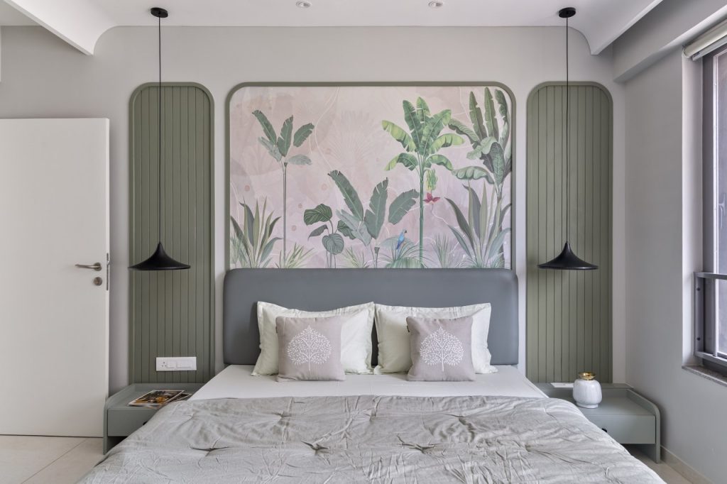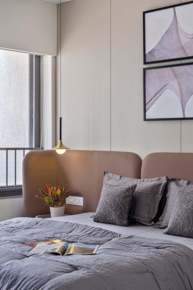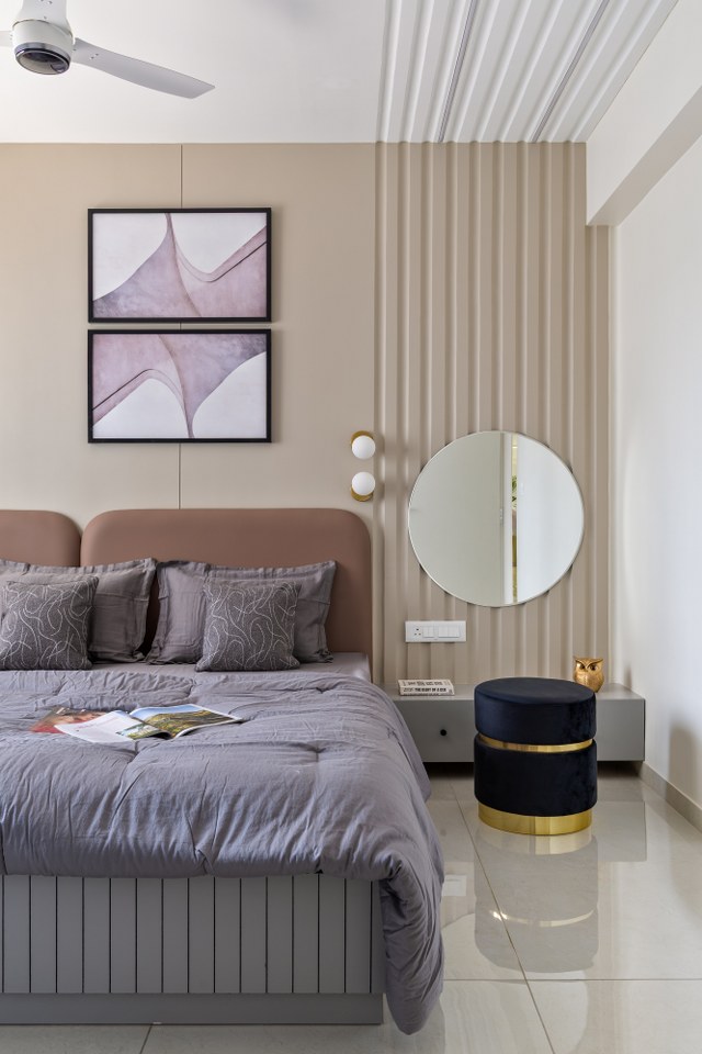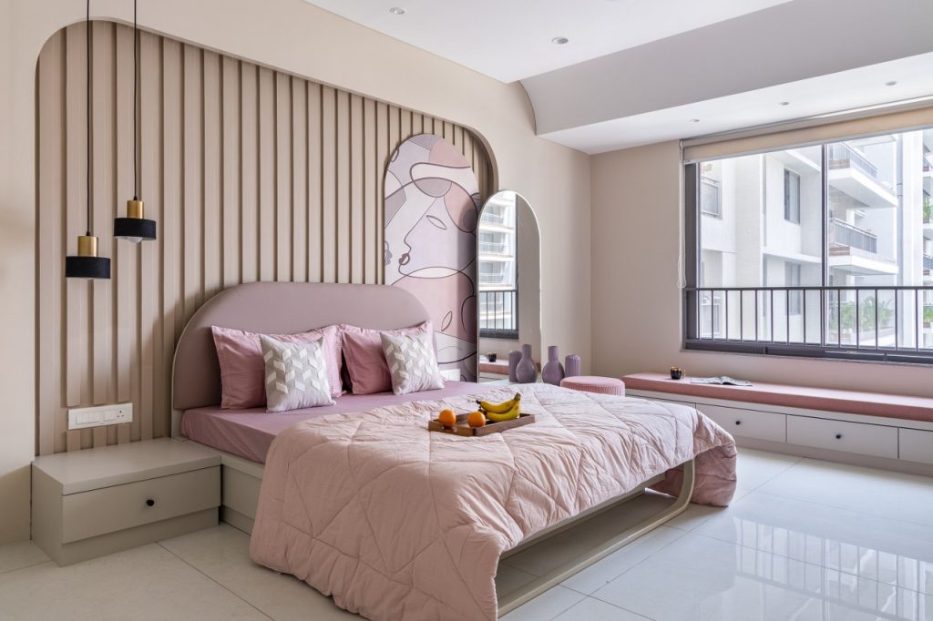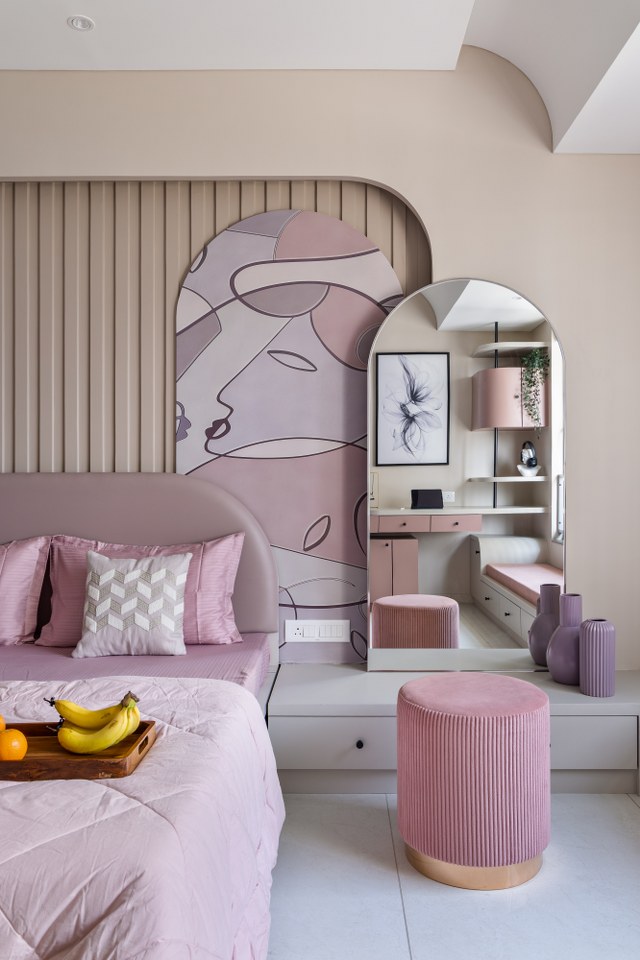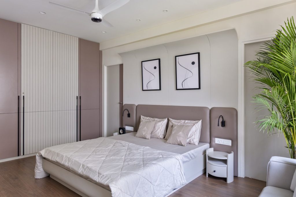 The master bedroom is a calming escape in shades of beige, off-white, and muted mauve. The headboard—upholstered in fabric—rises just halfway up the wall, giving way to graceful arched panelling that brings soft drama and verticality, supported by the tubular side tables.