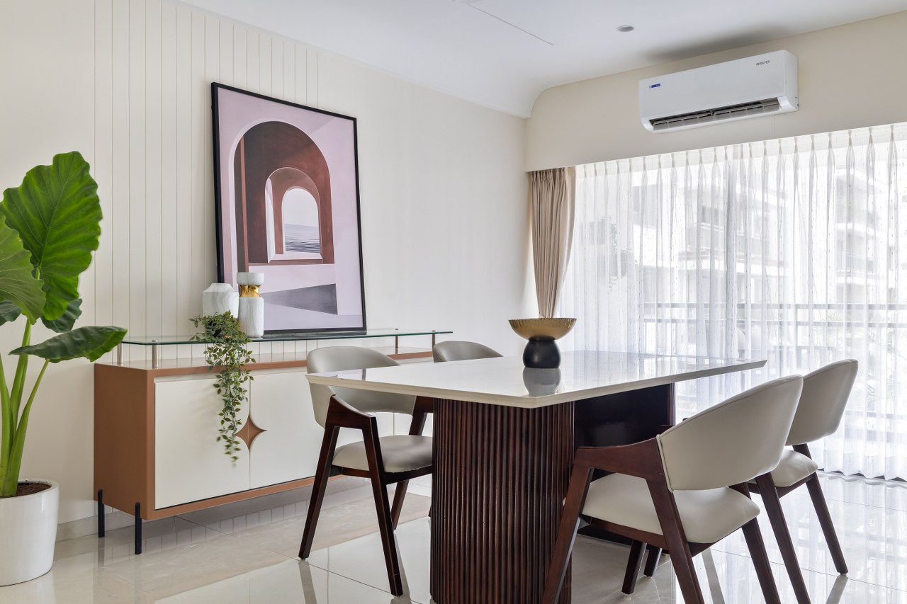 A six-seater wooden table with a solid fluted base, paired with upholstered chairs in muted tones creates a warm, welcoming spot for meals and memories. A console adds functionality while beautifying the space.