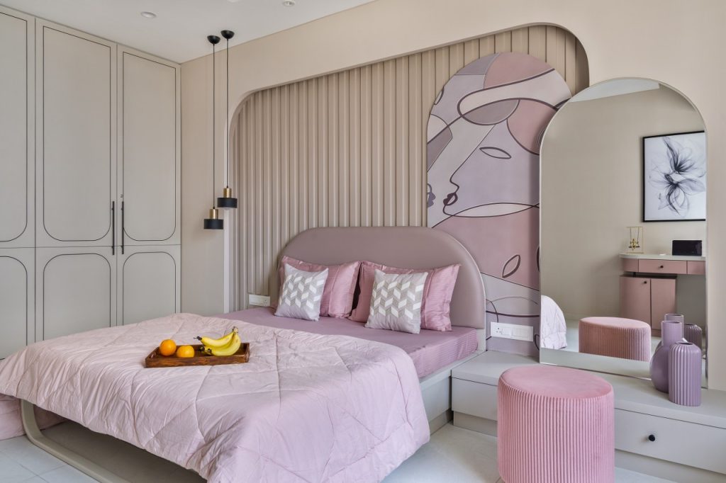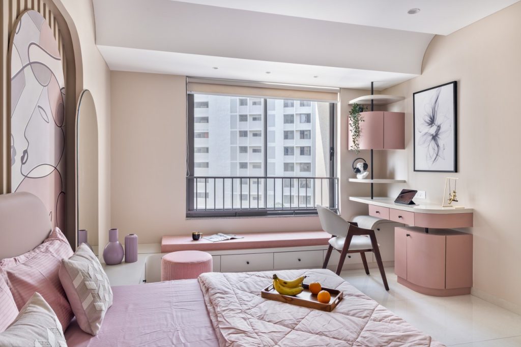 The daughter’s room is defined by soft blushing hues that lend it softness and curves that add a pinch of playfulness.