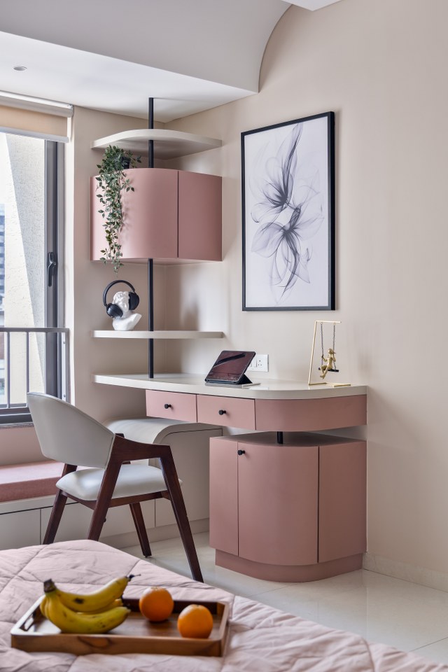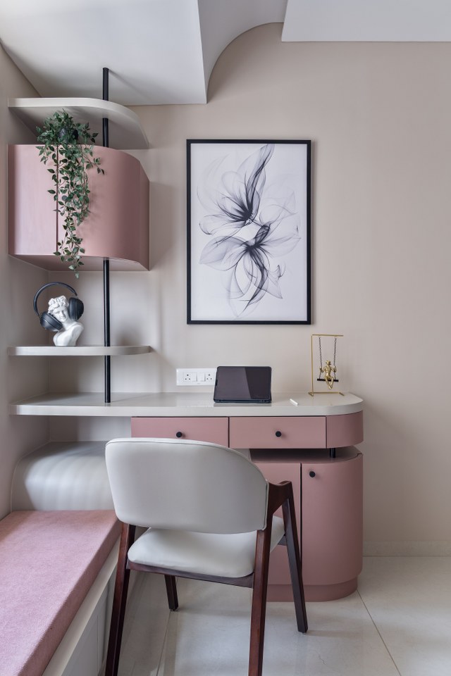 The study table, with its curved edges and round shelving suspended by elegant black rods, is in itself a piece of art. This seamless rhythm of curves unites the room, creating a space that feels warm, fluid, and beautifully whole.