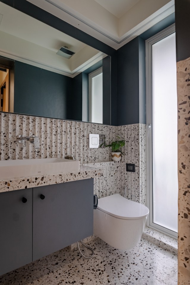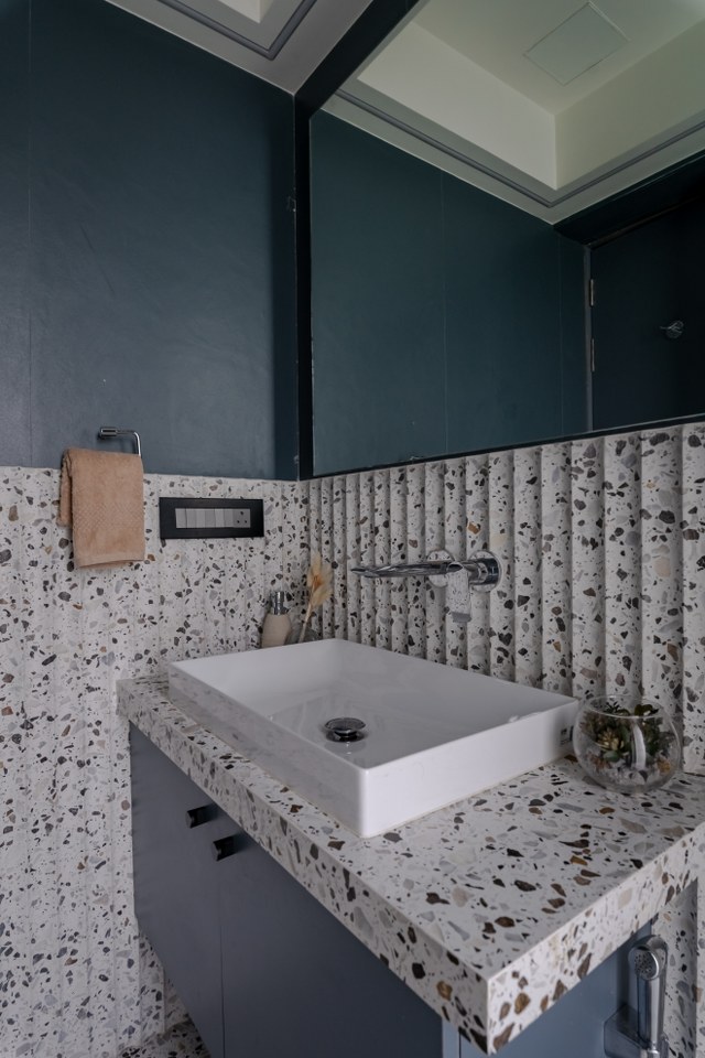 The flooring tells its own story. Kota stone in aged finish, with gently vibrating edges, grounds the space with earthy honesty.