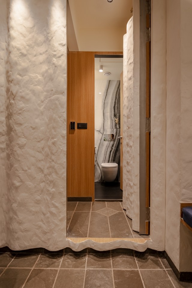 Behind it, a textured wall quietly holds space. Its depth and warmth create a powerful, understated prologue to what lies within a reminder that design doesn’t always need to shout. Sometimes, it simply breathes.