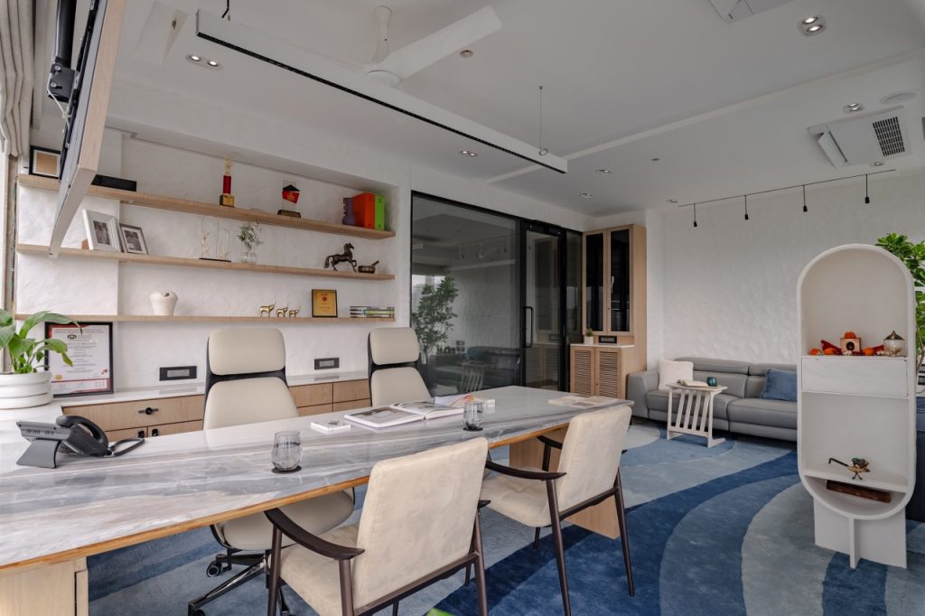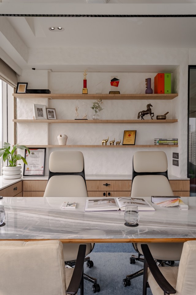 In the niche, a serene idol of Ganpati Bappa offers quiet blessings to every idea that takes shape here. A hidden doorway within the panelling leads to the washrooms elegantly concealed to preserve the visual clarity of the space.