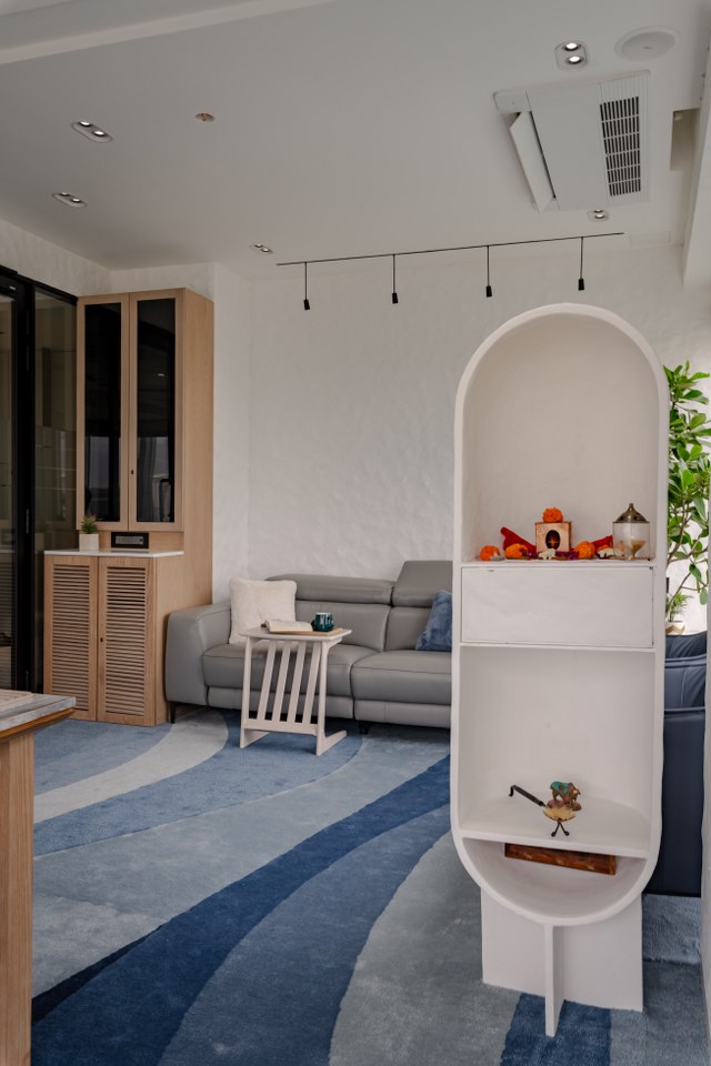 Each thread carries centuries of craftsmanship, now woven into the fabric of this modern space. Motorised curtains glide with ease, creating privacy without breaking the visual rhythm. Tunable lighting from Changi allows the room to shift in mood as the day flows from sunlight to focus to reflection. And in one quiet corner, a small Mandir keeps the space spiritually anchored.