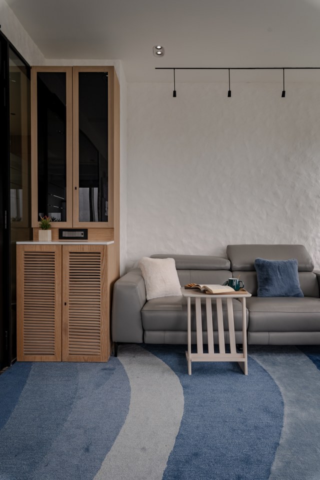 Throughout the studio, the walls are finished in a Santorini white texture timeless, warm, and soft. It’s a canvas that lets other design elements breathe.