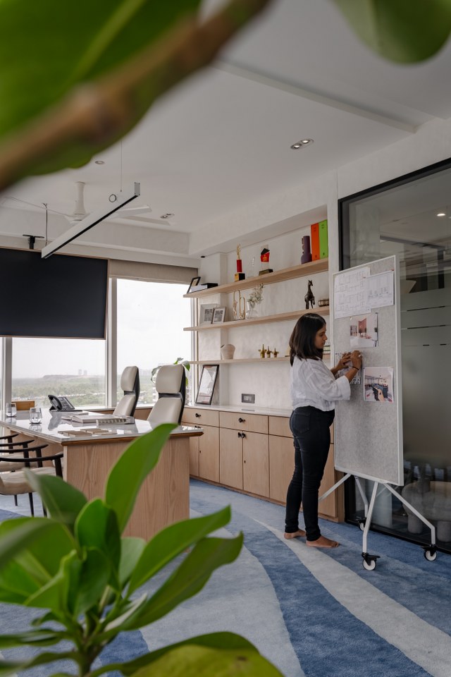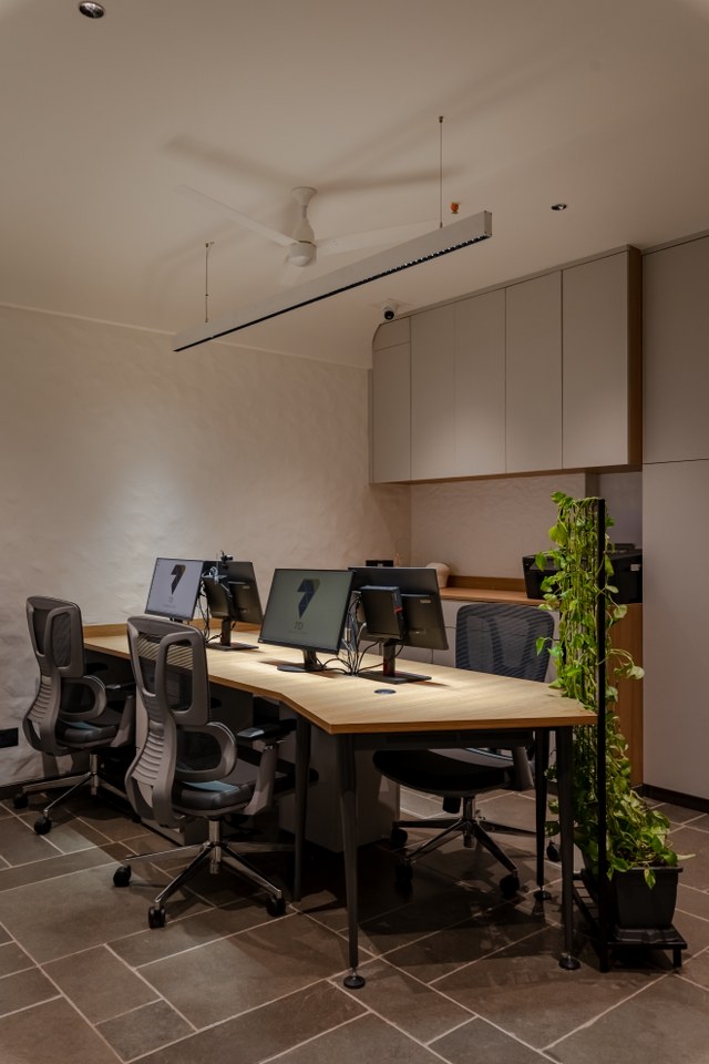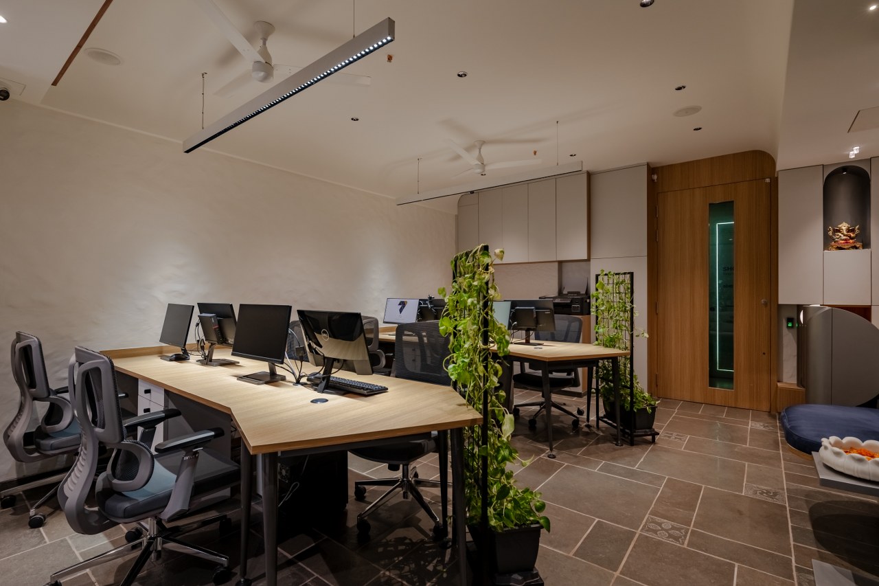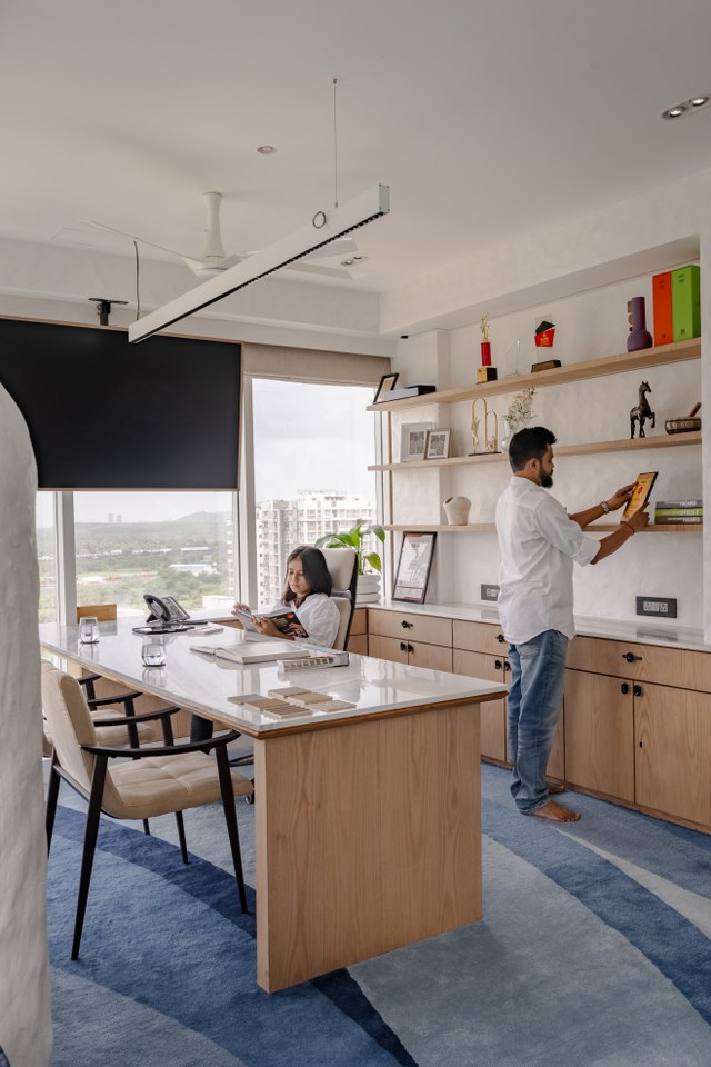 The tour now leads into the heart of the studio the Founders’ Cabin, a space shared by Mukesh and Divyaa. A long linear desk anchors the room, allowing shared planning, designing, and dreaming.