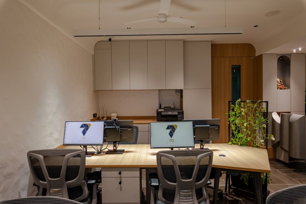 Step into the open spatial layout of the head office of 7D Design Studio and you’ll sense it instantly this is not just an office. “Designers craft a living, breathing narrative—not just to build it, but to make it felt. They shape every wall, texture, and proportion like storytellers layering intention, philosophy, and the subtle rhythm of space into every detail.”