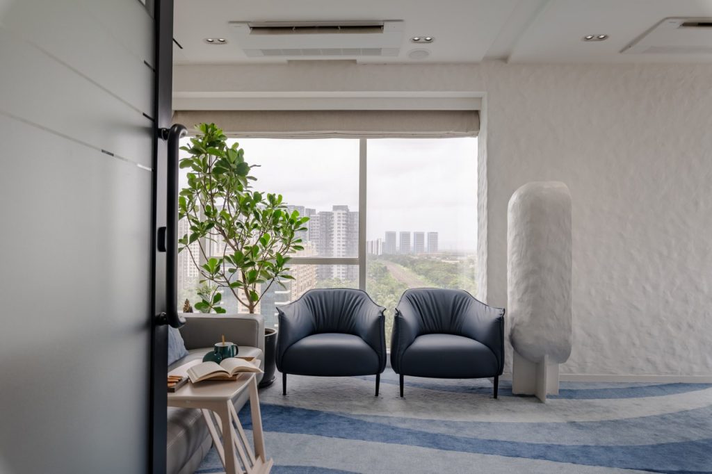 As the door opens, you’re welcomed into a reception area that is clean, calm, and beautifully restrained. The backdrop wall ripples with subtle wave textures a visual ode to rhythm, flow, and creative energy in motion.
