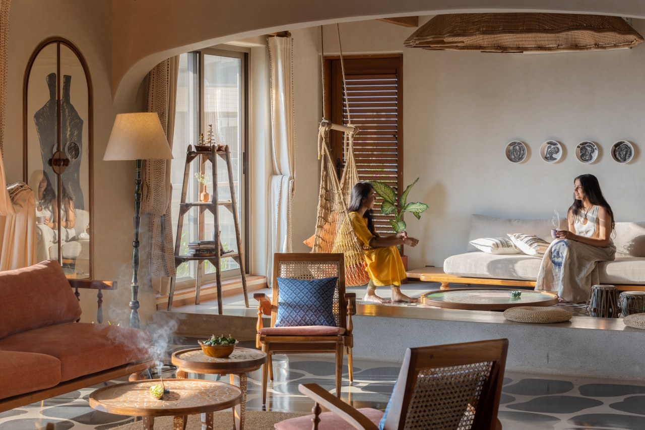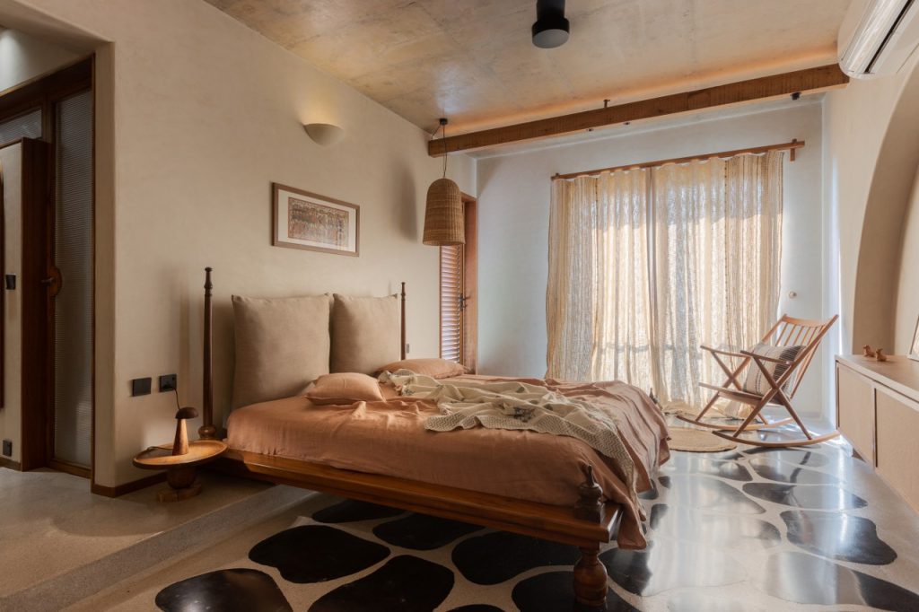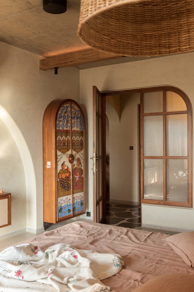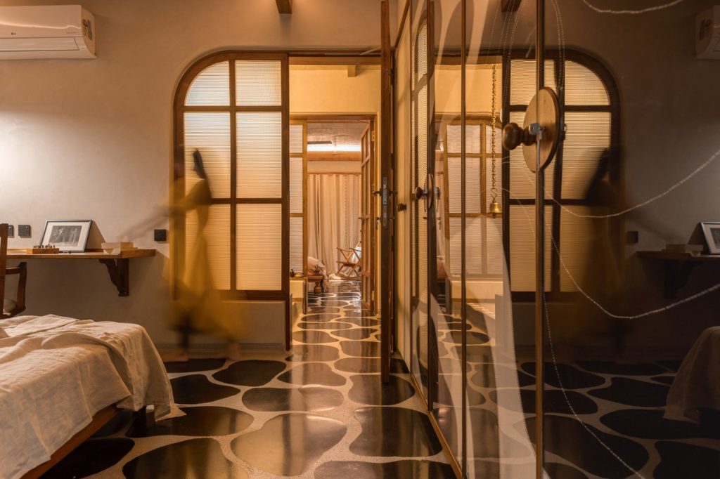 Reclaimed wood prevails throughout, bearing the hand impressions of local craftspeople. Cane, lime plaster, moulded surfaces and natural finishes introduce a wabi-sabi softness that tempers the structure, while muted base tones sit beside fearless bursts of soft pink, indigo, and even stark orange.