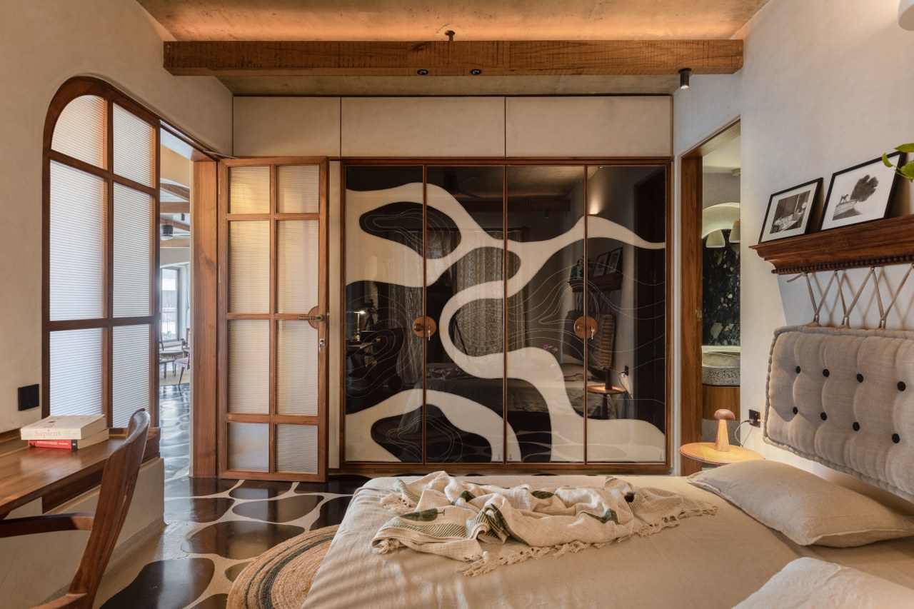 This sensibility extends into the private quarters. In the master suite, a gently carved bed is paired with a capsule-shaped cabinet that cradles hand-painted art, while another bedroom offsets a floating Chesterfield cushion headboard against a flamboyant wardrobe animated with bold, fluid waves.
