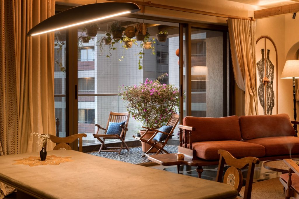 The living space flows into the dining area, which in turn looks out to the balcony, allowing the entire expanse to breathe as one. Furniture remains light, flexible and casual, capable of reorienting itself towards the kitchen, the balcony, or inward depending on the moment.