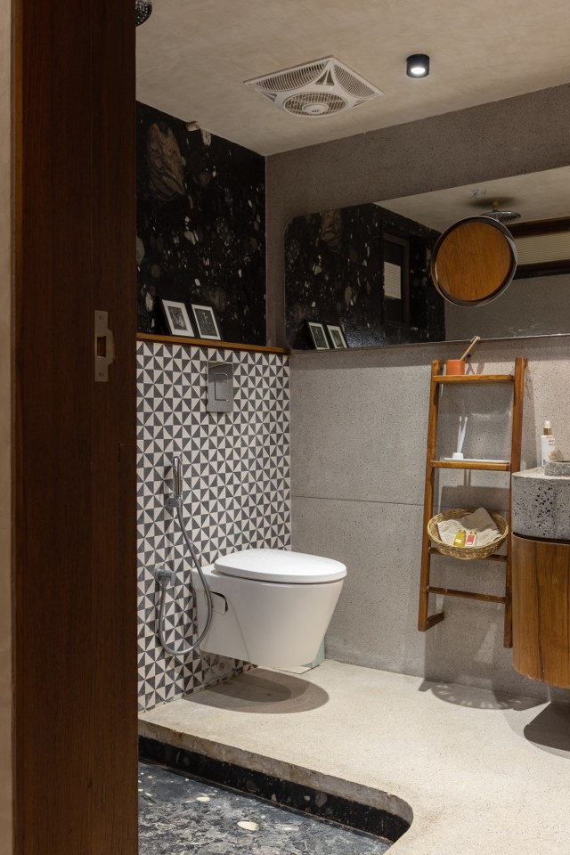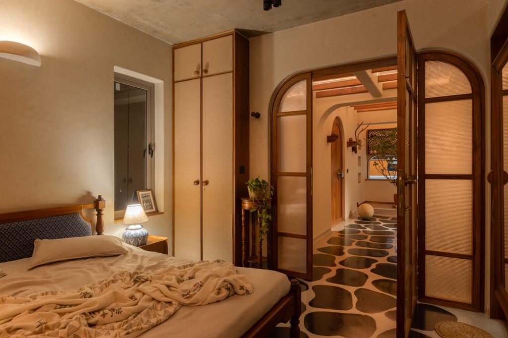 The kitchen is conceived as an island in the truest sense — central, open, and visually accessible from almost every space. Reclaimed wood runs through the cabinetry, mosaic tiles line the shutters, and ceramic vitrified tiles wrap the countertop, keeping the palette earthy yet precise. It reconnects visually with the entrance foyer to extend sightlines and offer orientation. “The kitchen is the pulse of the house,” he says. “Why should it be hidden?”