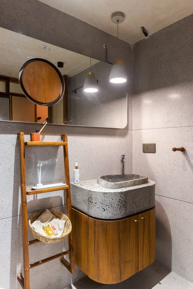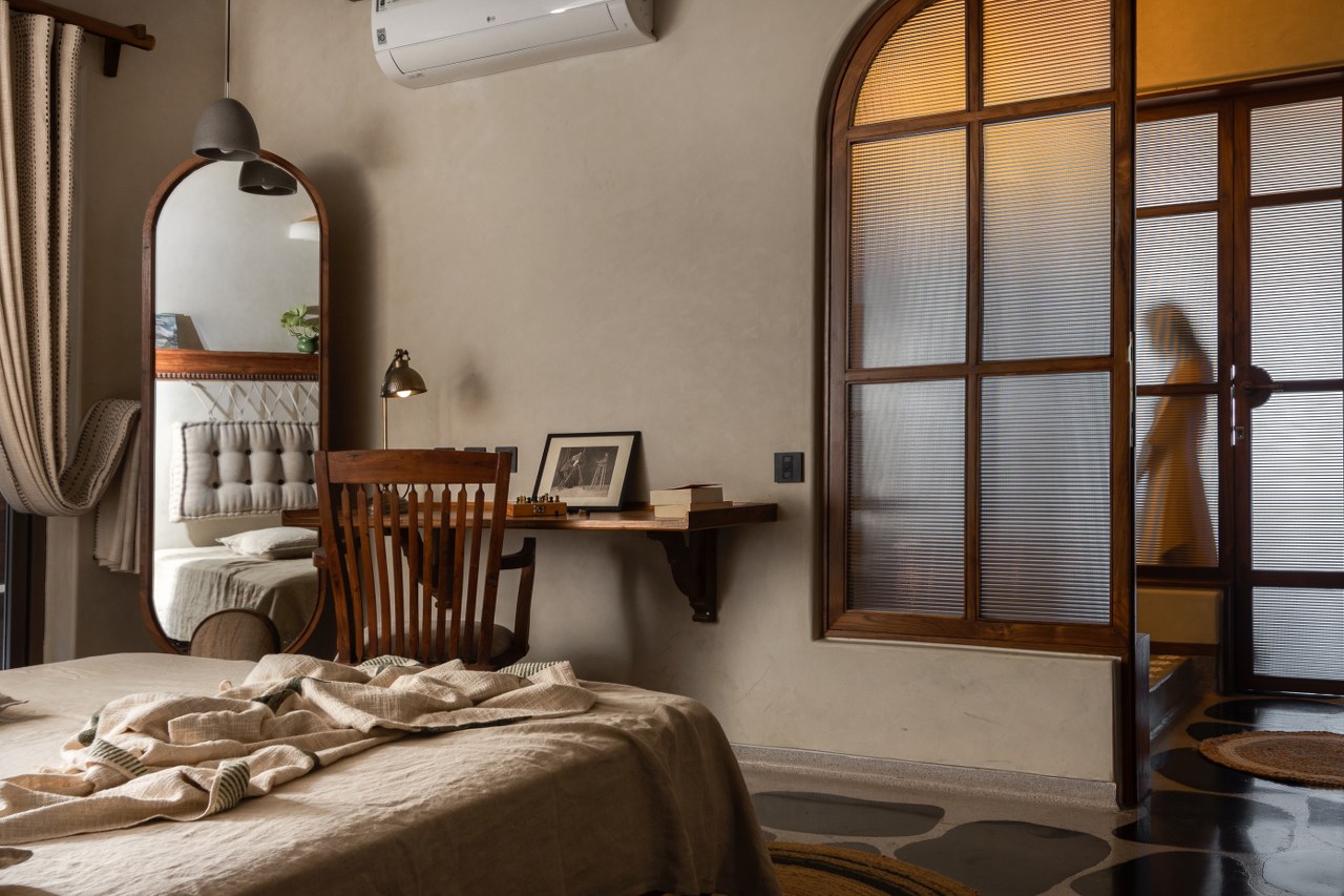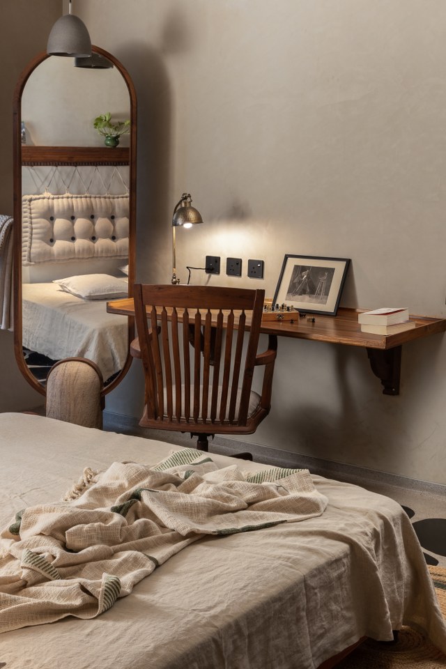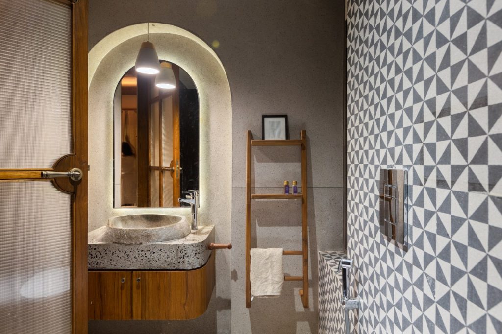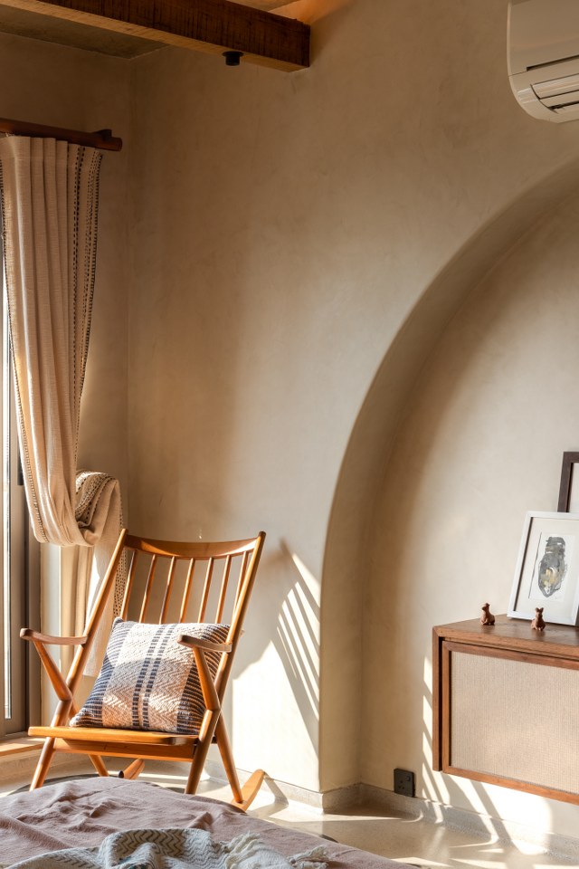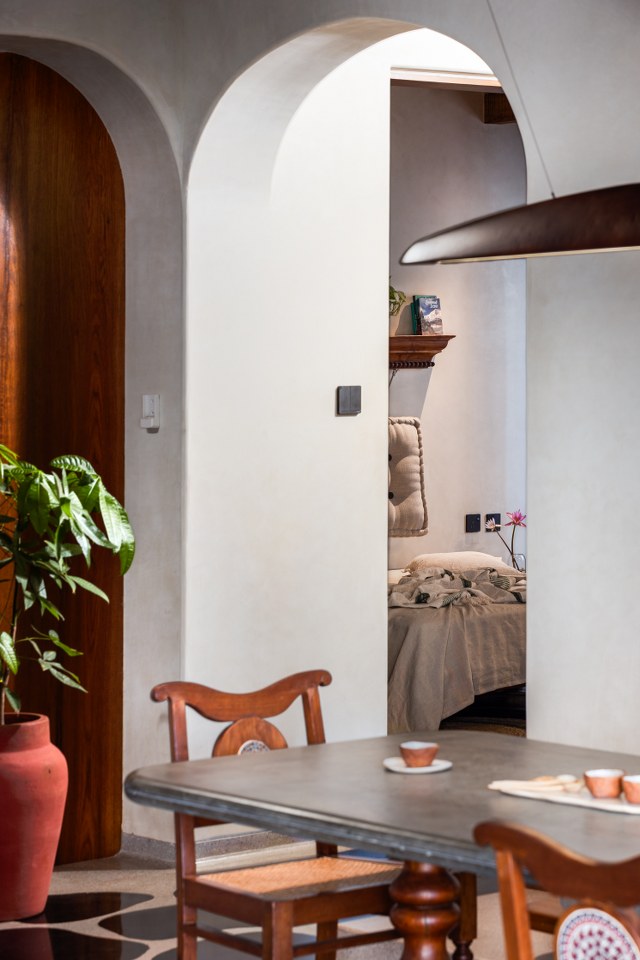 “I wanted the furniture to behave the way people do — informally,” he explains. Topped in concrete with wooden inlay, the dining table is supported by a concrete leg, and paired with chairs dressed in ceramic coasters sourced from Istanbul — repurposed as chair backs. Elsewhere, terracotta planters soften corners and niches appear organically, referencing quintessential Indian interiors.