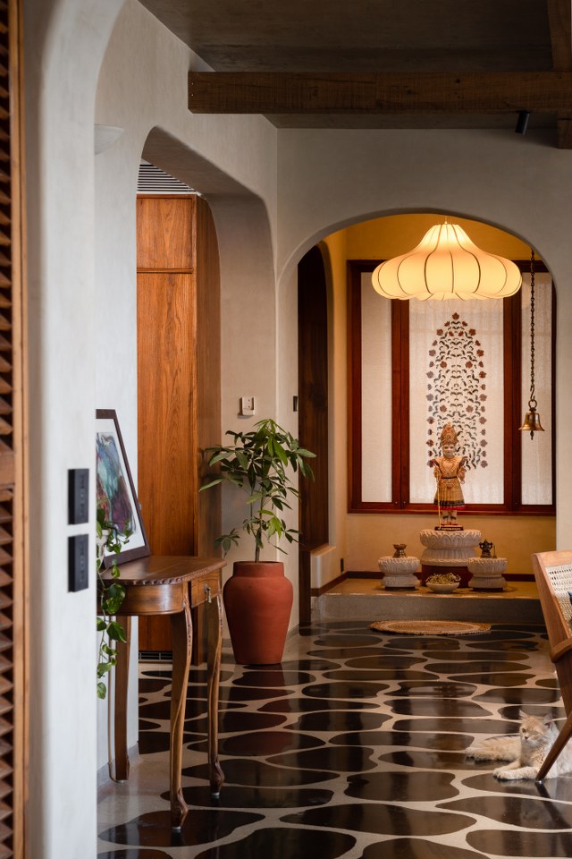 “I didn’t want to design a rigid house,” says Viral. “I wanted to let the home evolve — the way spaces did when I was growing up.” After two decades of designing for others, his own 2000 Sq. Ft. 3 BHK became the place to translate that memory into built form. The idea of an “open house” becomes its organising principle, yielding a spatial continuum of interconnected volumes — fluid, porous and resistant to rigid enclosure. Arched openings appear where walls might have stood, and raised platforms delineate zones.