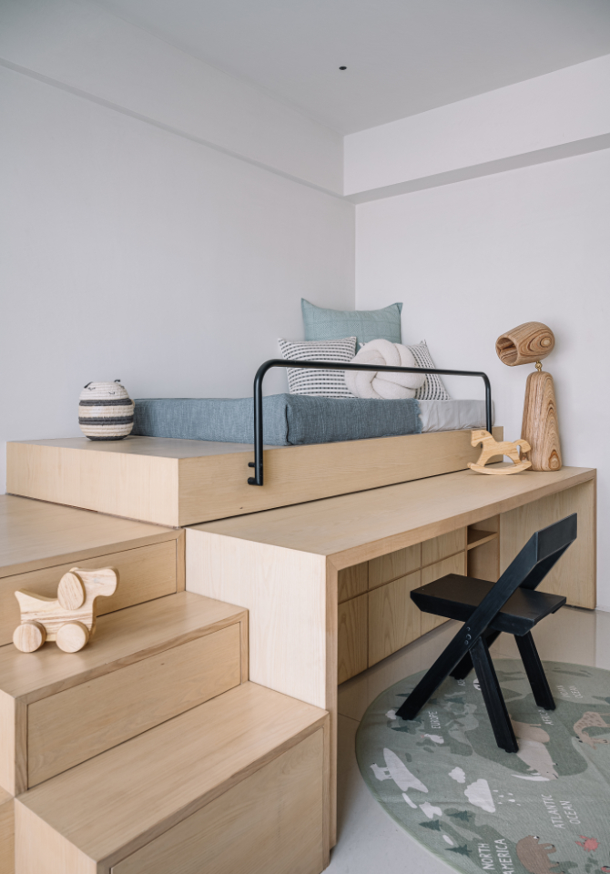 A concealed door within the travertine panelling leads to their son’s room, where Workshop Inc. designed a storage bed with a sliding desk that maximizes function without compromising style.