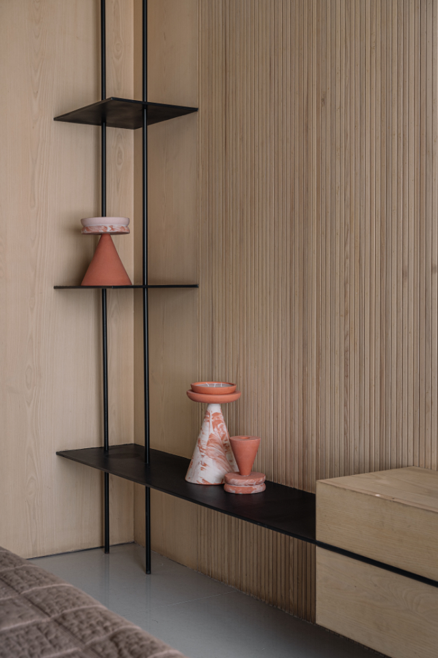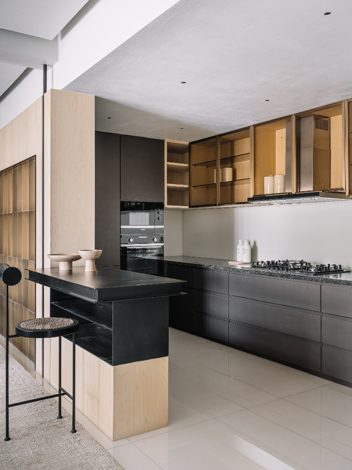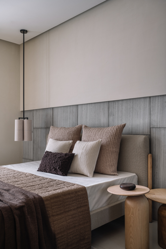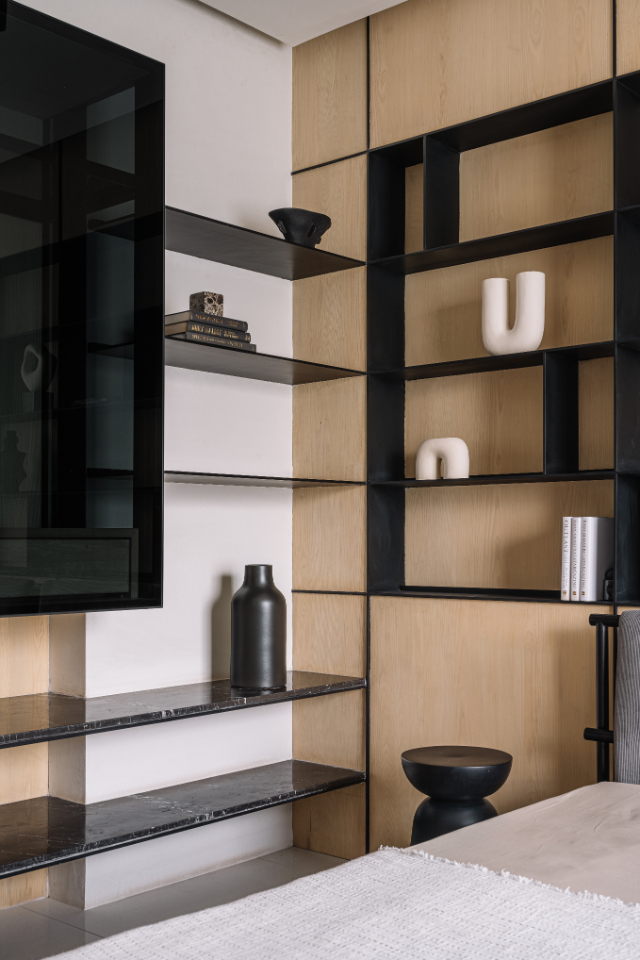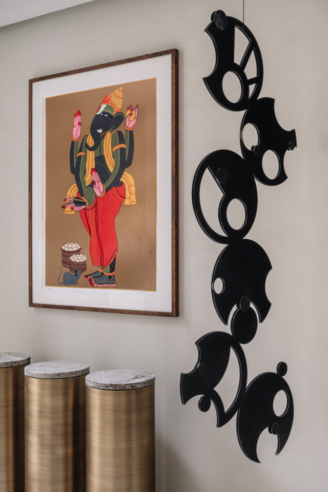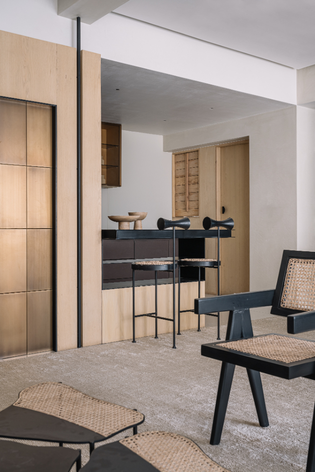 Crossing the arched black-metal vestibule, accented with Morii Designs’ rustic blue textile artwork, the transformation is immediate. The chaos of the city falls away, replaced by what Varun describes as “a restful, monochromatic shell to retreat into.”