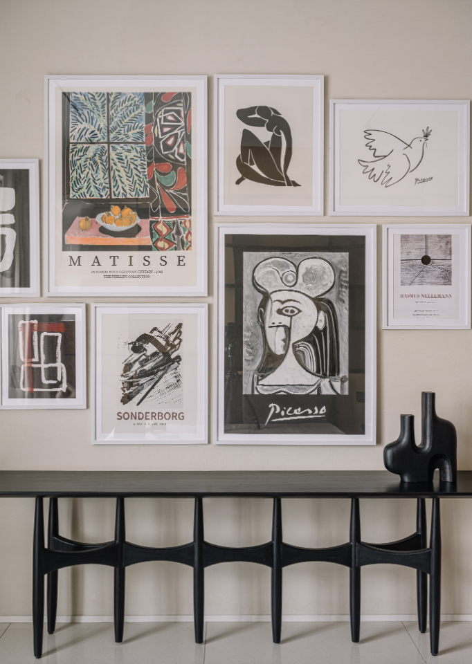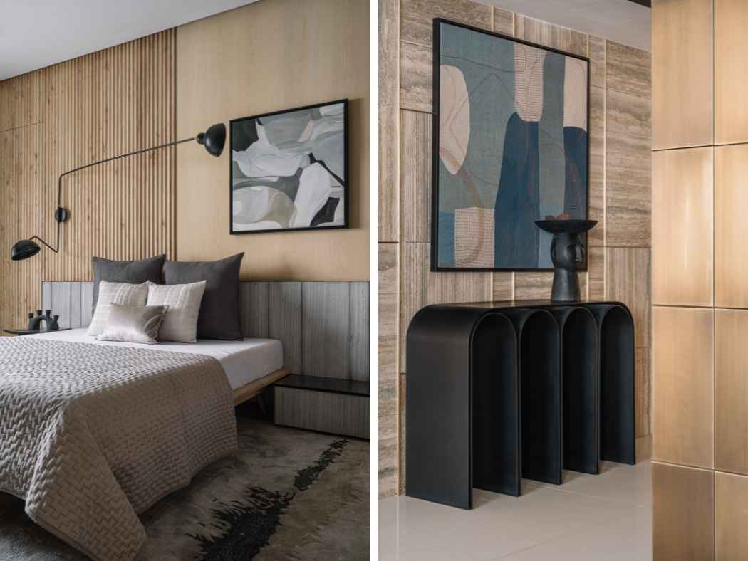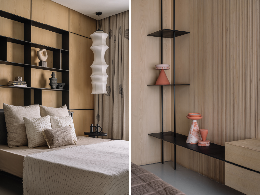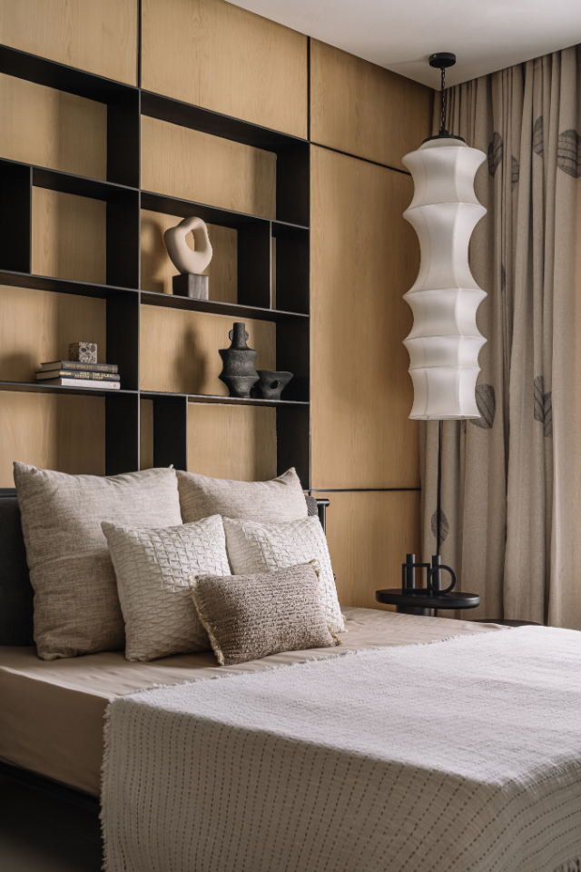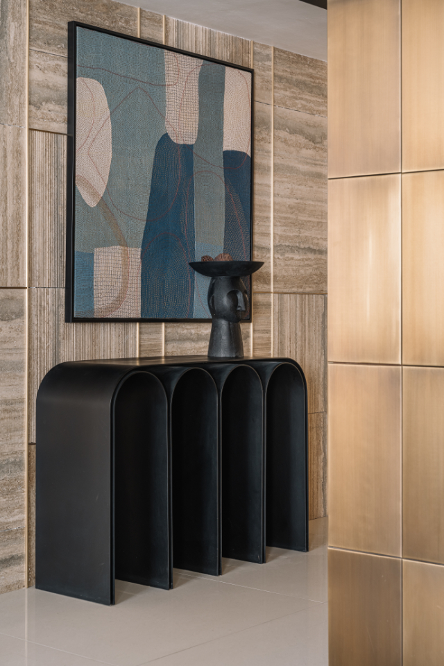 Throughout the home, Workshop Inc. has orchestrated what Varun describes as “a dialogue between organic forms and rectilinear shells, smooth and textured surfaces alongside light and dark tones.” Deep blacks and metallic brass accents punctuate the tonal backdrop, while natural timber, stone, and linen create a foundation of authenticity. The deliberate avoidance of harsh architectural lighting in favor of subtle pendant lamps ensures that every corner is bathed in a diffused, welcoming glow.