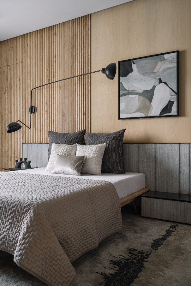 While the communal spaces celebrate connection, the four bedrooms retreat to the rear of the home. The master suite epitomizes this philosophy of restful refuge. A pale-grey upholstered bed anchors the room, surrounded by slated and smooth oak veneer walls that exude quiet sophistication. Back-painted glass storage shutters keep the space light, while Aztec-print armchairs frame a window with tranquil views.