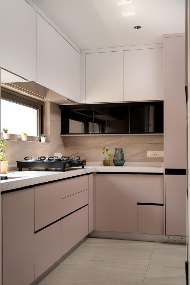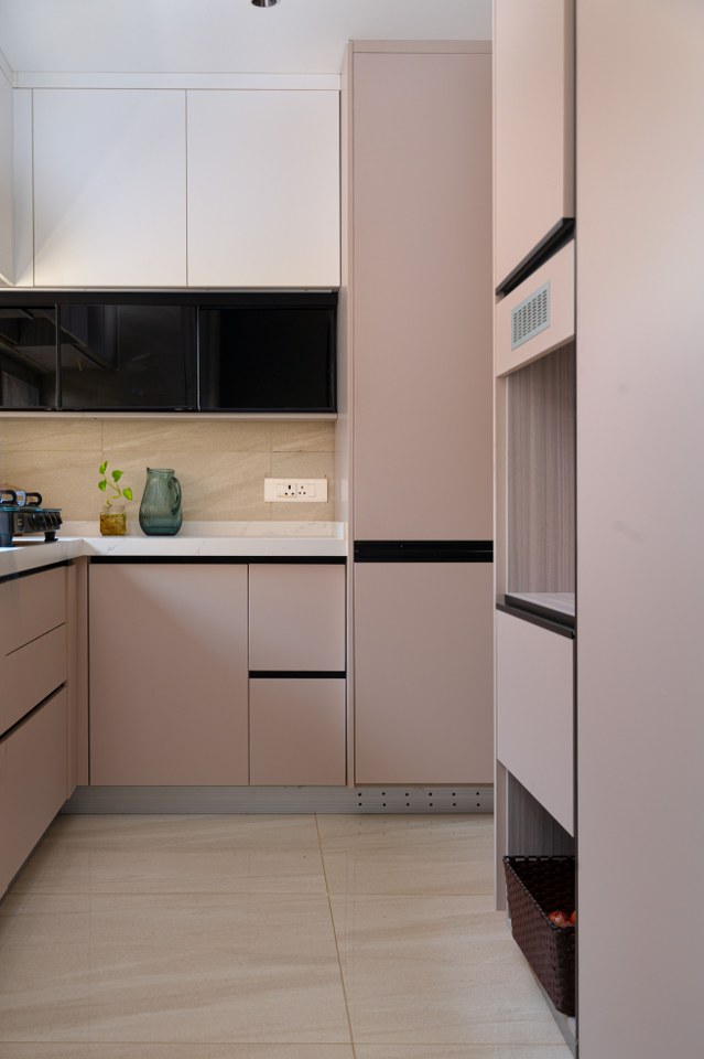 The compact 60 sq. ft. kitchen of the apartment is a masterclass in efficient design, where, form and function blend seamlessly. The east-facing window floods the space with natural light. It highlights the elegant cappuccino-hued cabinetry, beautifully contrasted with black and white accents. The contemporary design aesthetic is both stylish and practical, incorporating a range of clever storage solutions and essential accessories. These include a convenient bottle pullout, a space-saving corner unit, and tandem drawers for optimal organization. There’s also a pantry for storing essentials and an OTG unit for added convenience. Despite its modest size, this kitchen packs a big punch. It blends style and functionality, making it perfect for culinary creativity.