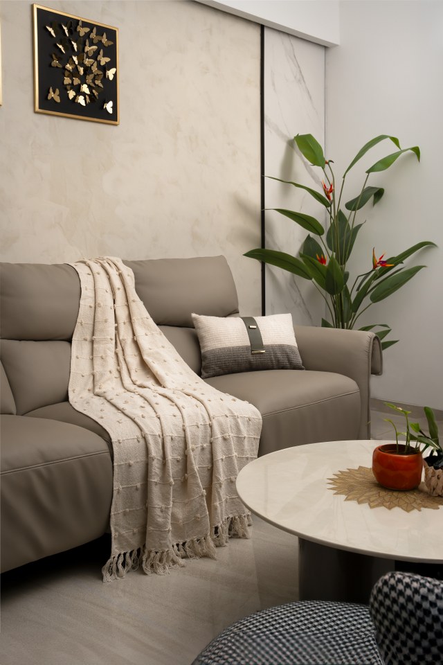 Adding a touch of luxury and sophistication, golden butterfly frames adorn the sofa backdrop, infusing the wall with a sense of glamour and refinement. The Italian sofa, with its sleek lines and understated elegance, blends seamlessly into the backdrop, providing a comfortable and inviting seating area. However, to avoid a sense of monotony, a single, vibrant maroon chair bursts forth, injecting a dynamic splash of color into the space. This bold, eye-catching accent expertly disrupts the calm, creating a sense of visual interest and depth. At the heart of the room, an Onyx marble center table provides a sense of grounding and stability, while a thoughtfully placed touch of nature adds a sense of vitality and freshness. This harmonious balance of textures, colors, and natural elements culminates in a tranquil space that is at once serene, stylish, and utterly captivating.