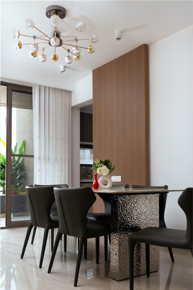The dining table, crafted from rich Onyx marble, is a masterful blend of contrasting elements. A combination of sleek acrylic legs on one side and a hammered metal finish on the other creates a striking effect, adding depth and visual interest to the space. Suspended above the dining table, a beautiful fan cum light chandelier draws the eye upward, casting a warm, inviting glow over the entire area.