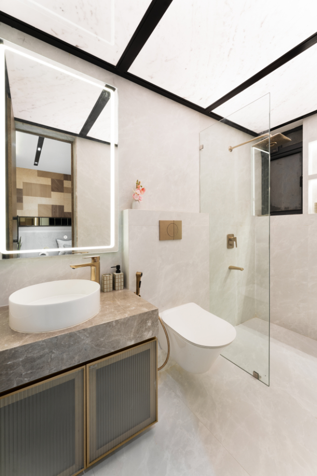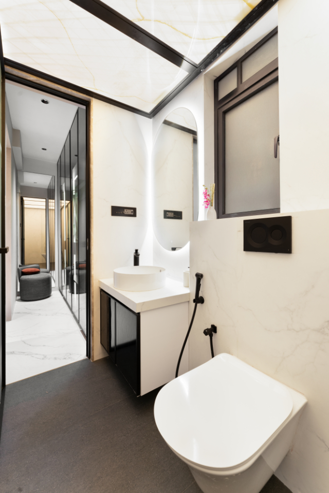 The kitchen and dining areas in this 3 bhk apartment are conceived as seamless extensions of the living space, unified through material continuity and proportion. The galley-style kitchen prioritises efficiency and precision, softened by a muted palette of warm greys and off-whites. Marble-finished surfaces lend understated sophistication, while fluted glass upper cabinets introduce translucency and visual lightness. Integrated lighting enhances both functionality and ambience.