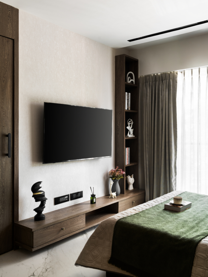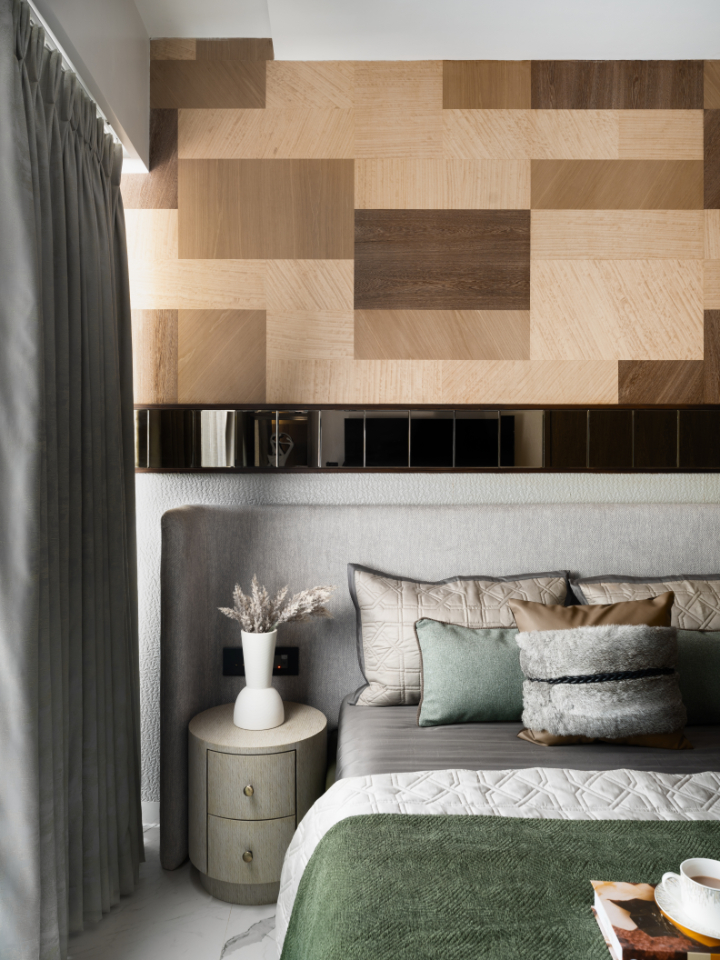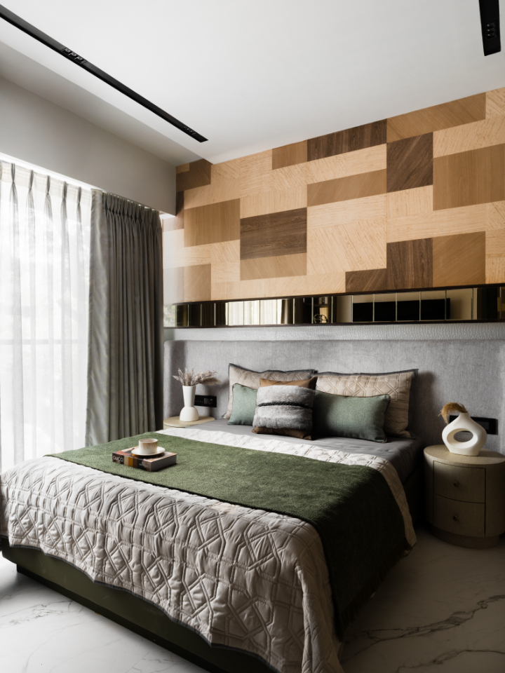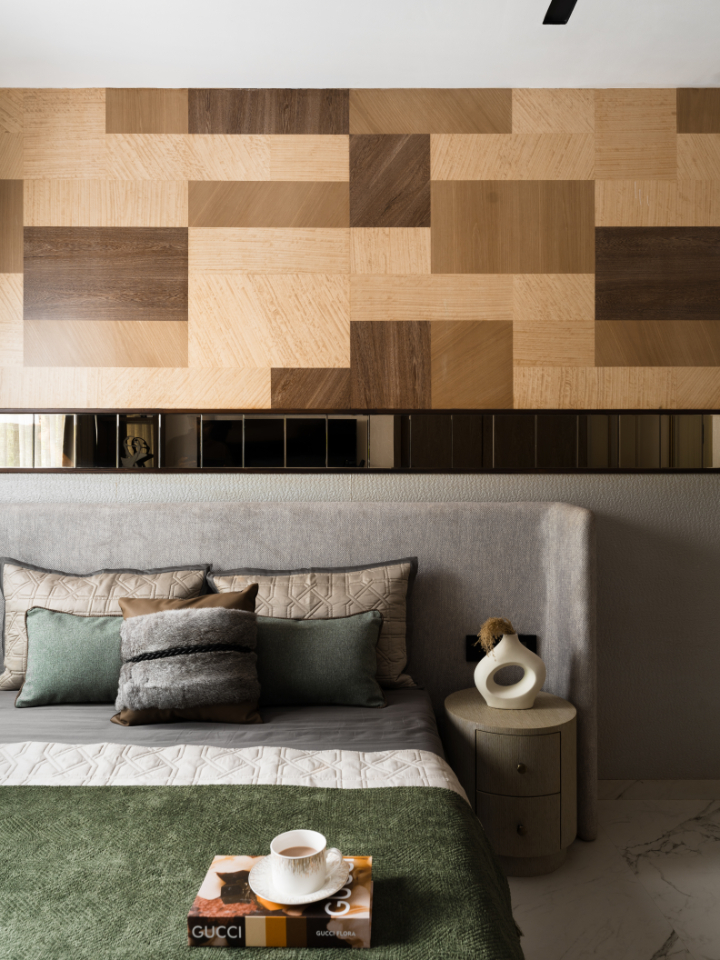 The first bedroom is conceived as a calm, inward-looking retreat. A custom bespoke headboard wall composed using three different veneer sheets with varied grains, cut and placed strategically to create depth and rhythm, punctuated by a slim mirrored band that subtly amplifies light.