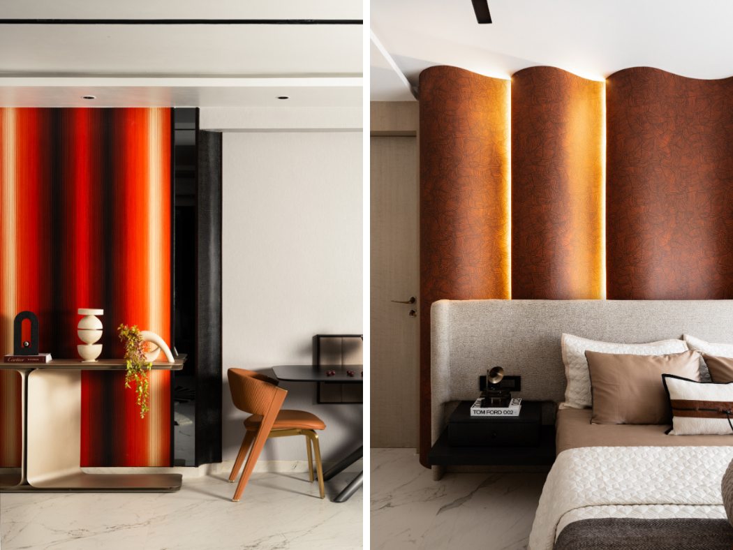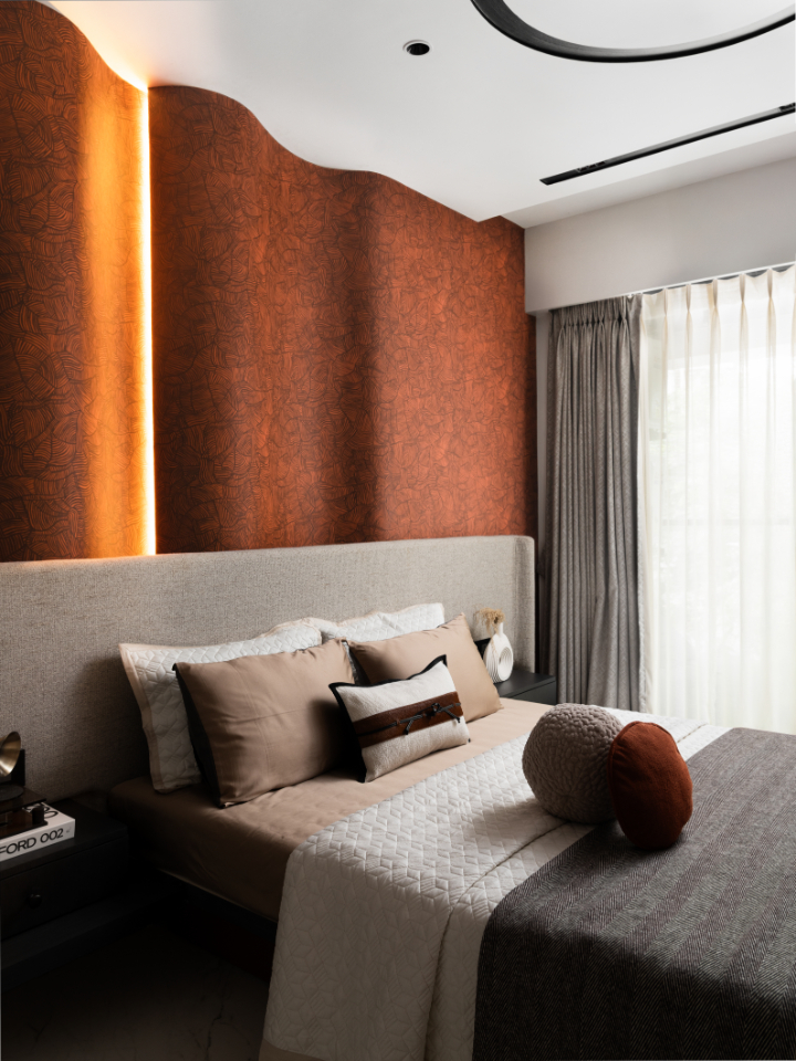 The second bedroom introduces a warmer, more expressive palette while remaining aligned with the home’s overall language. “Designers crafted the sculpted headboard wall in rich terracotta tones, accentuating its soft curves with concealed lighting that highlights its fluid form.”