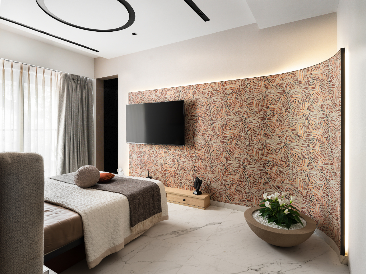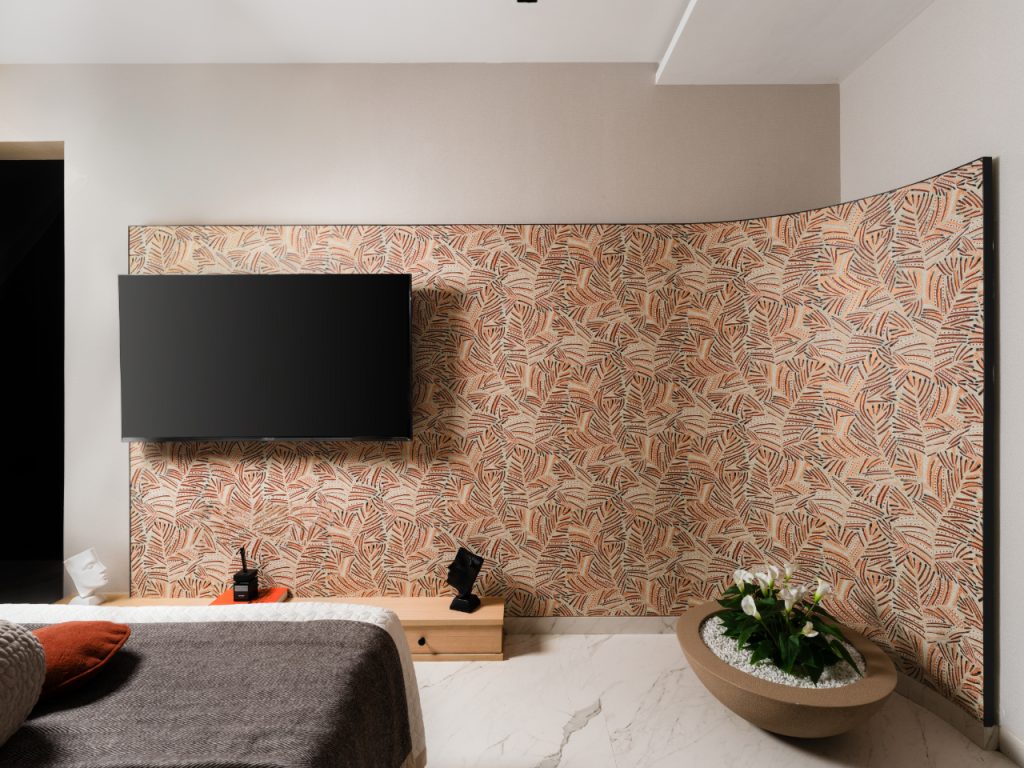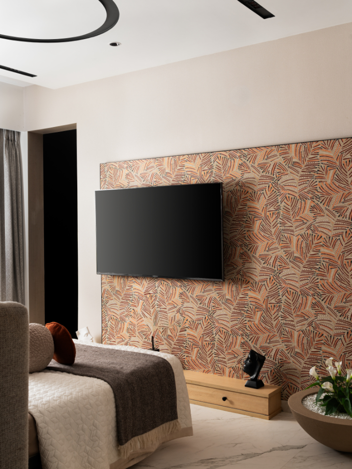 Neutral bedding and tactile textiles allow the feature wall to remain the focal point. A wallpapered media wall adds pattern and depth, balanced by minimal joinery and filtered natural light, creating a space that feels intimate yet composed.