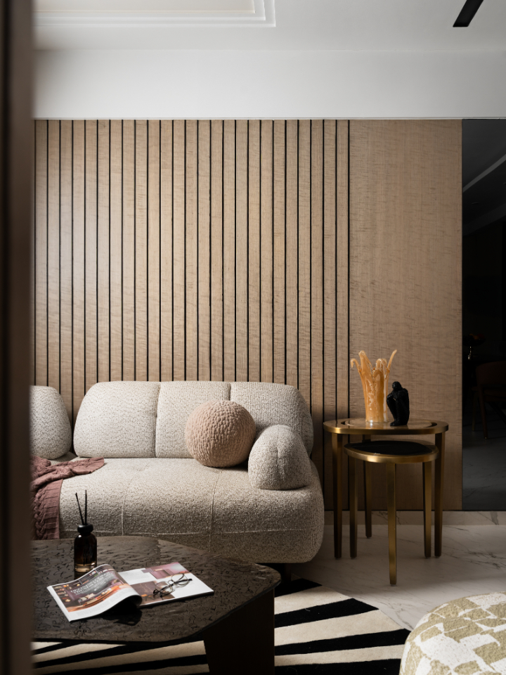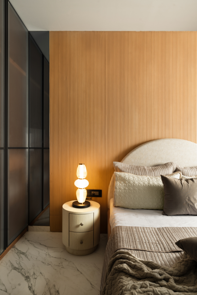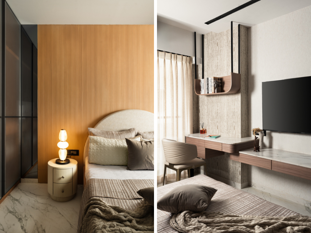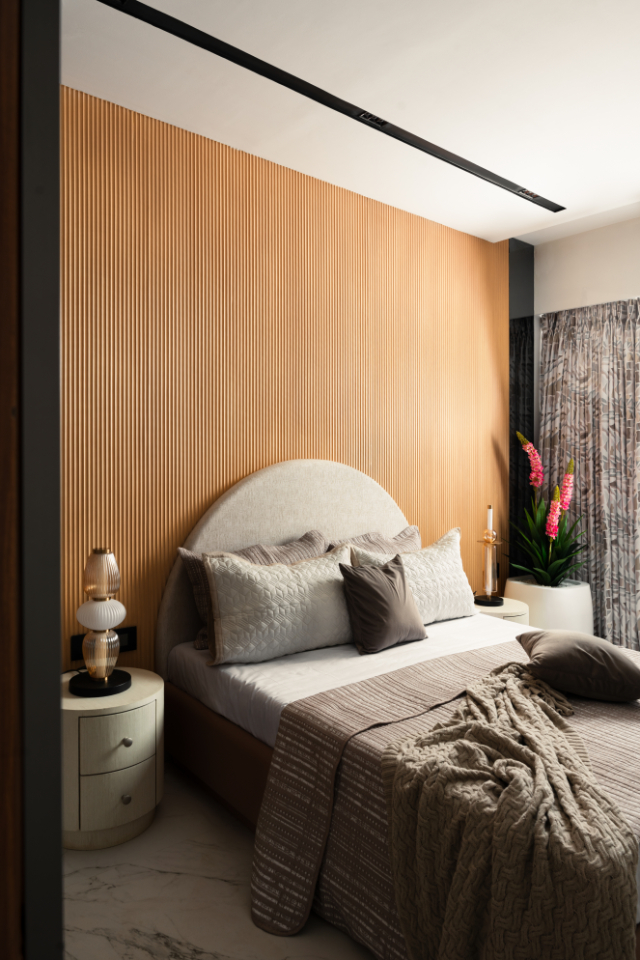 Designed as a multifunctional retreat, the third bedroom balances rest and productivity with ease. A vertically fluted wooden headboard wall establishes warmth and texture, softened by gentle curves and ambient bedside lighting.