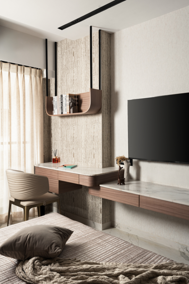 The palette remains restrained—layered neutrals and soft upholstery—allowing materiality to take precedence. An integrated study and media unit in warm wood and marble finishes adds functionality without disrupting visual calm, resulting in a room that adapts effortlessly to changing needs.