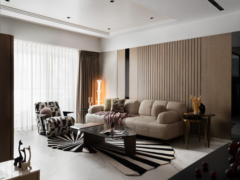 Statement elements—including a patterned lounge chair, sculptural coffee table, and curated console vignette—add moments of contrast. Soft lighting and filtered daylight balance openness with intimacy, reinforcing the room’s role as both a gathering space and a place to unwind.