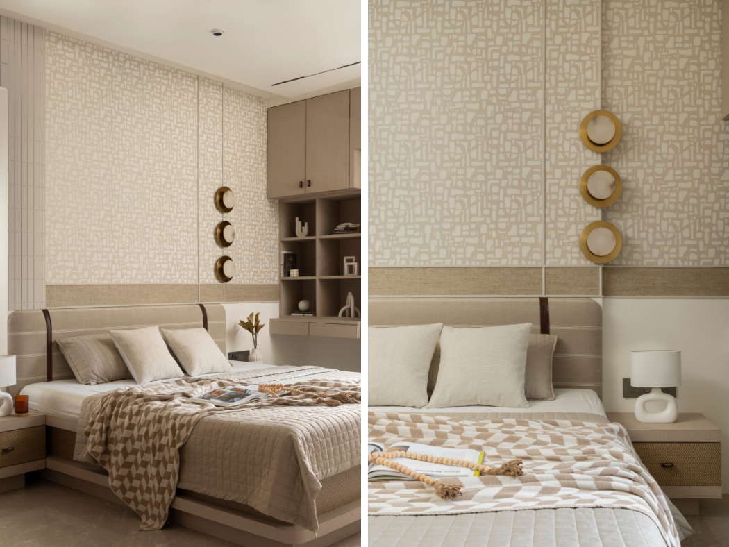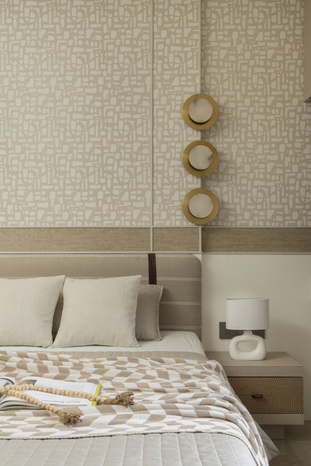 The master bedroom is a masterclass in tonal layering. A muted palette of beiges, taupes, and warm whites forms the base, with the bed’s fabric cladding anchoring the room. The feature wall behind the headboard showcases a textured panel layered with abstract linear forms, while three circular wall sconces in brushed brass add a striking rhythm and warmth.