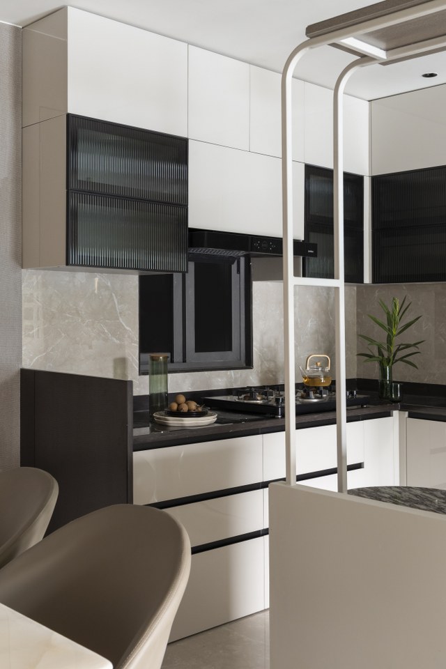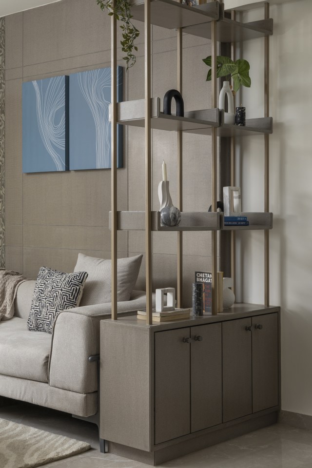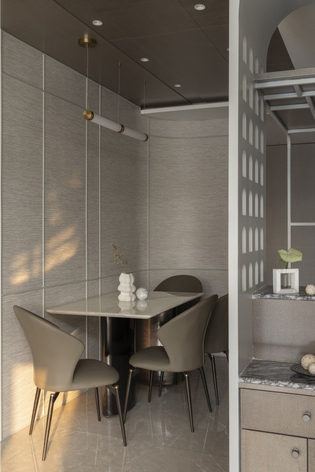 One of the most thoughtful design interventions in this city home lies in the seamless spatial demarcation between the living, dining, and kitchen zones. Rather than resorting to heavy physical barriers, a custom-designed partition subtly delineates the functions while maintaining an open, fluid visual connection across the public areas of the home.