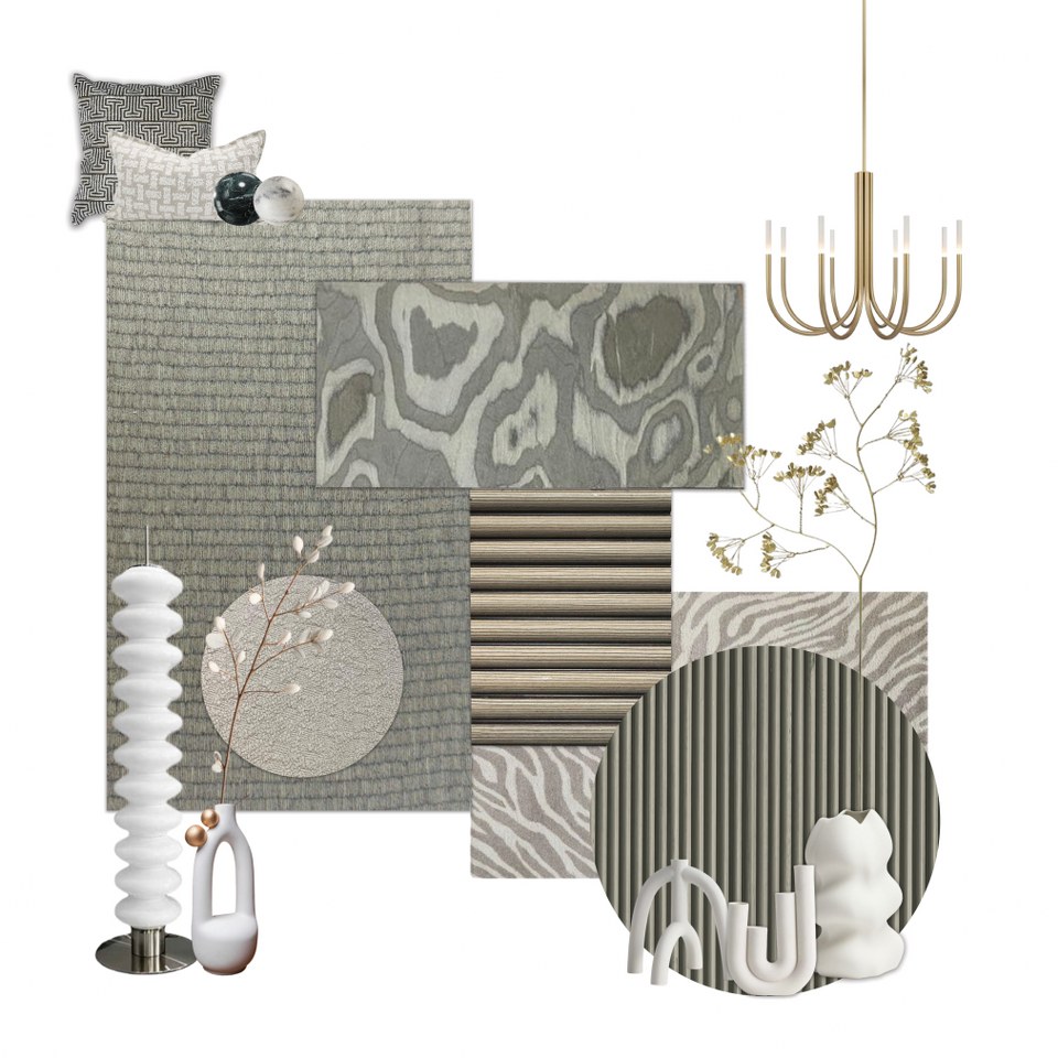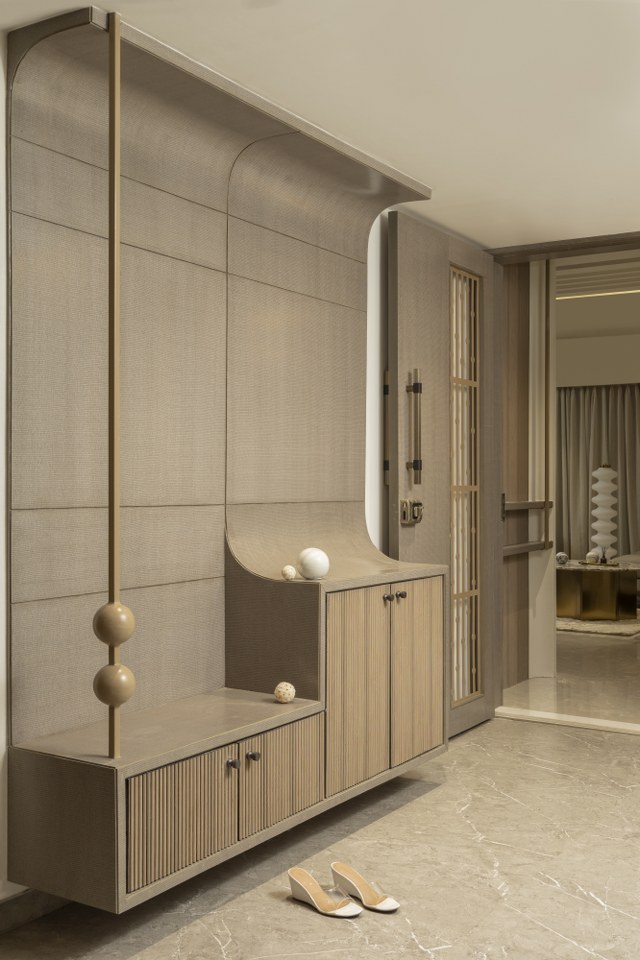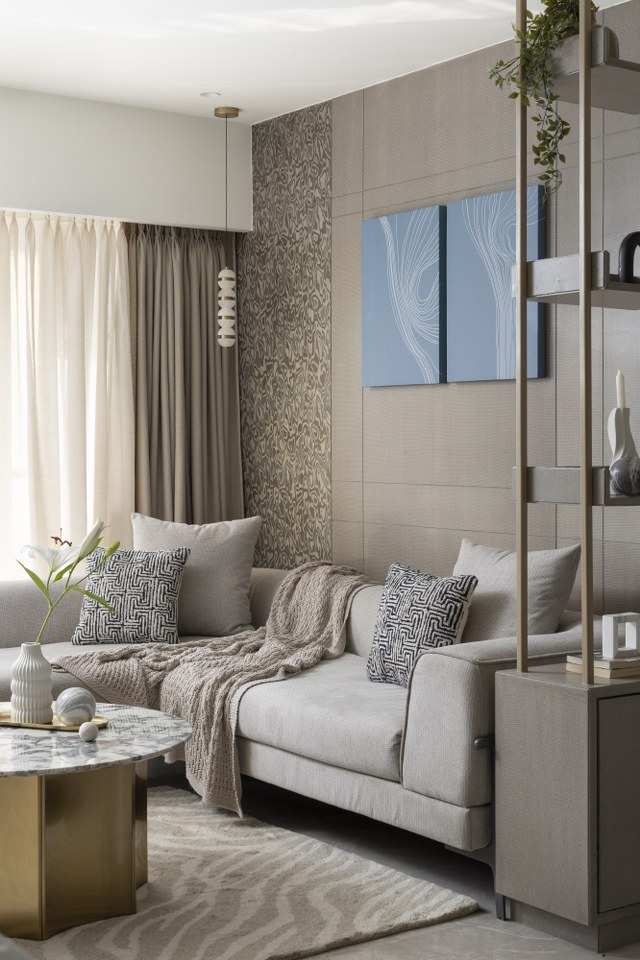 The living area is a well-balanced ensemble of muted hues and soft finishes, punctuated by carefully curated forms. Upholstered furniture in tonal creams and taupes sits atop a soft-textured rug, creating a zone of comfort. The backdrop wall emerges as a focal feature, elegantly clad in warm-toned veneer panels with meticulously crafted vertical grooves. This richly textured surface enhances the spatial depth while creating a quiet rhythm in the overall composition. Brass accents and sculptural décor pieces lend a touch of luxe without overwhelming the space. Light dances in through sheer drapes, illuminating the environment with a quiet elegance.