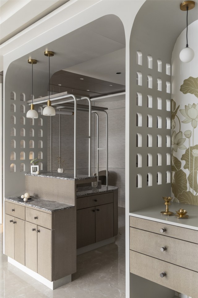 Cradled in a quiet nook, the mandir is a distilled moment of spirituality. Designed with reverence, its form language is clean and geometric, but deeply emotive. Warm wood tones, layered lighting, and carefully placed artefacts create an atmosphere that invites contemplation without distraction. Despite its compact footprint, the space feels expansive in soul — a gentle retreat within the home.