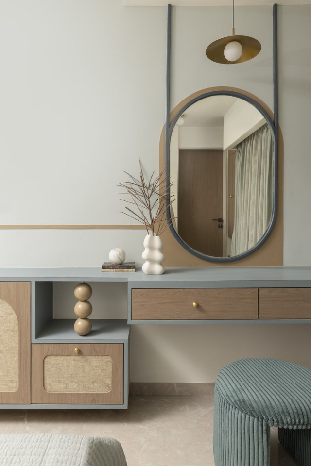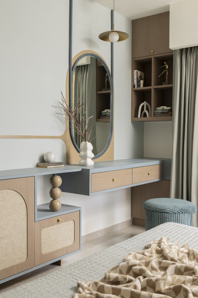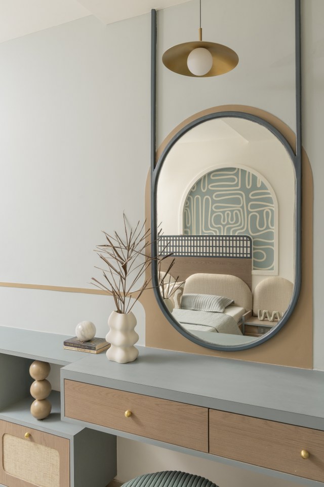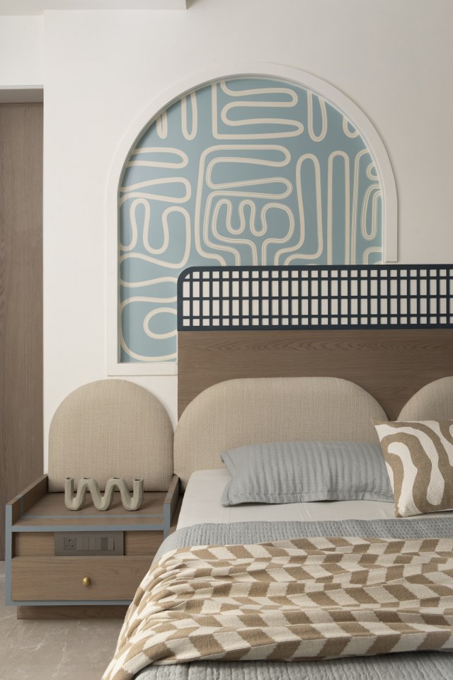 Designed with a sense of mature elegance, the daughter’s bedroom blends playfulness and poise. A curated wallpaper becomes the central feature, offering a subtle burst of geometry and color. The furniture, light in form yet rich in finish, complements the youthful spirit of the space. Tactile elements — from woven throws to pastel-toned upholstery — evoke a calming yet cheerful vibe, making the room a haven for both study and rest.