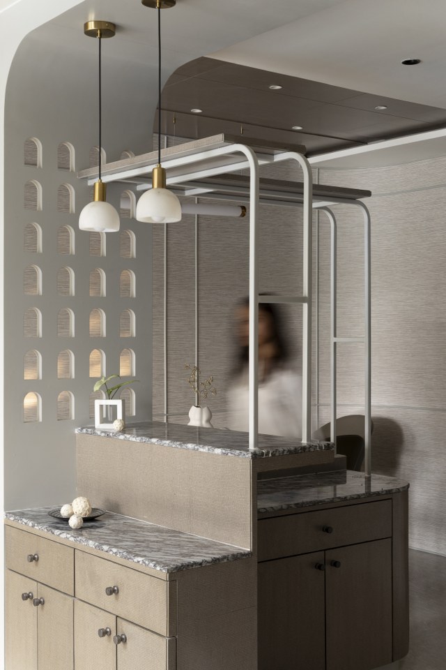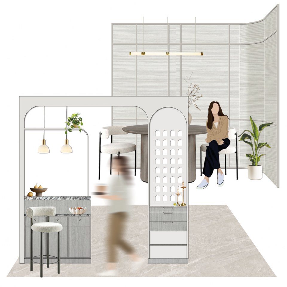 Crafted with a mix of vertical forms and open slots, the partition offers both partial privacy and permeability, allowing light, air, and conversation to flow effortlessly. This understated yet sculptural element becomes a defining anchor, balancing openness with definition