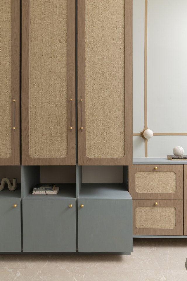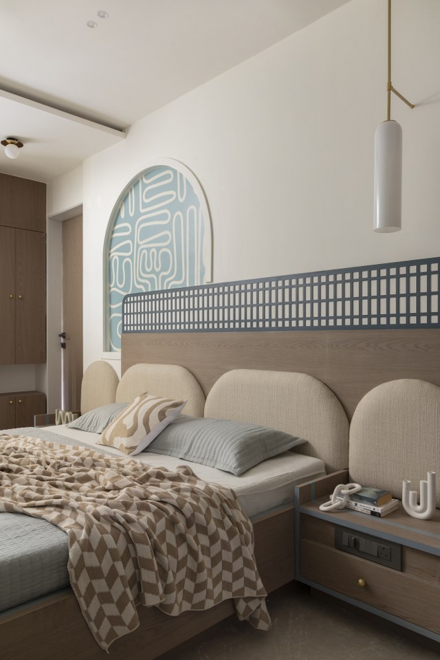 Custom cabinetry in fabric-finish laminates blends into the space, offering function without visual clutter. A checkered throw adds graphic balance to the otherwise soft landscape of textures and textiles. The result is a bedroom that whispers luxury – a cocoon of composure and craft.