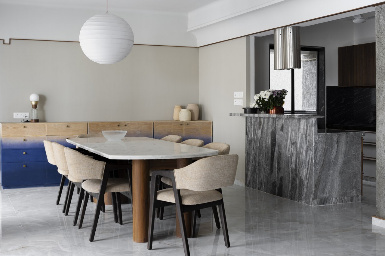 The open kitchen, integral to the couple’s lifestyle, was imagined as a dynamic space—a hub for conversation, collaboration, and connection. The island counter, clad in Italian marble strips, bridges the kitchen and dining areas.