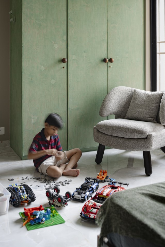 Moving into the private spaces, each room was designed as a unique world, reflecting its inhabitants’ personalities. The study, for instance, is a sanctuary—a concealed wooden cabin that prioritises focus and warmth. From the hidden door integrated into the living area’s panelling to its seamless wooden cladding and bent-glass study table, the space encourages deep work and creative immersion. Furthermore, it was imagined as a retreat within the home, a place to disconnect and concentrate fully.