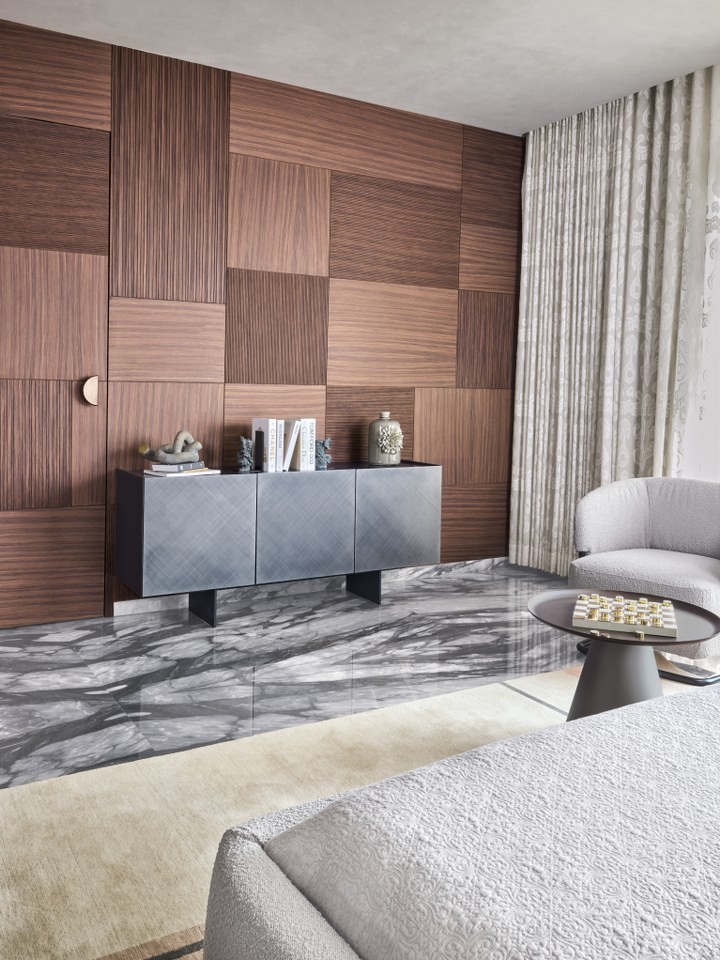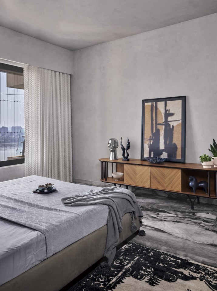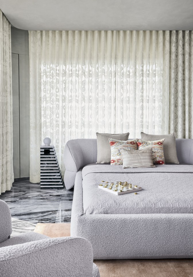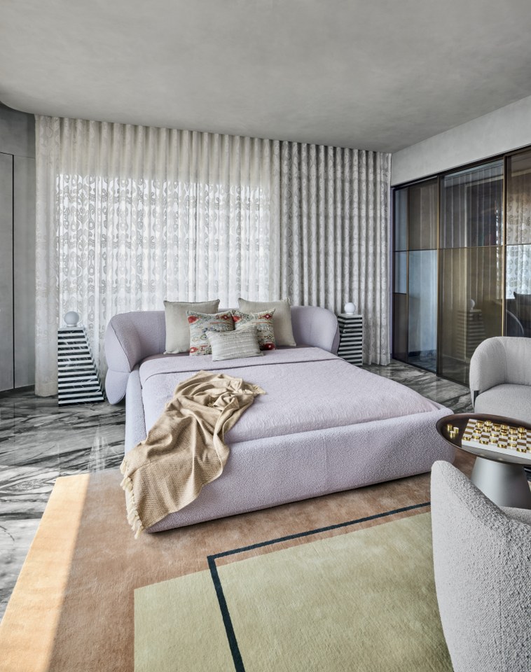 Calm defines the master bedroom, where a soft, tonal palette dances with light and shadow, enriched by tactile materials. A low-profile bed with bouclé fabric centers the space, flanked by bold striped tables, balancing softness and structure. Sheer drapes diffuse light over luxurious veined Italian marble flooring. A cozy armchair and sculptural side table create an intimate nook. Curved and linear elements merge modern comfort and elegance. Wood, stone, fabric, and light harmonize, crafting a timelessly modern atmosphere with calming grey upholstery and textured surfaces. A soft lime wash ceiling enhances the room’s tranquility, while a geometric layered side table lamp and strategic coffee table add distinct detail.