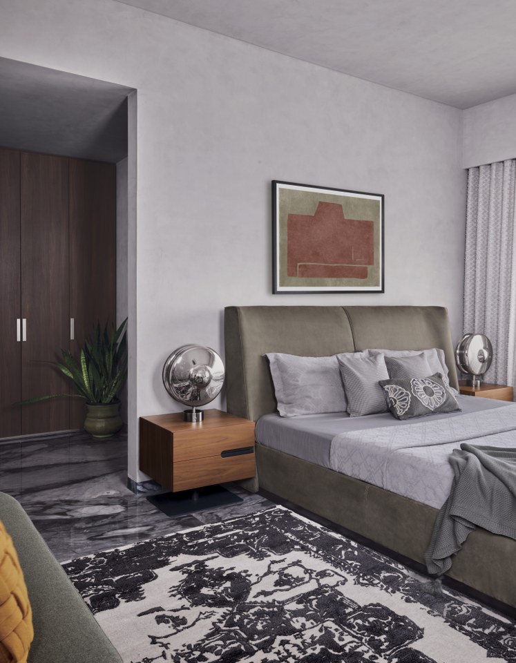 The guest bedroom offers a seamless blend of modern sophistication and understated luxury, exuding warmth and a welcoming charm with a calming neutral palette of soft greys and earthy tones, amplified by the interplay of light and shadow reflecting off framed abstract artwork. An arch in the ceiling invokes timelessness, while a soft lime texture on the walls and ceiling enhances the room’s spaciousness. Elegant wooden furniture is complemented by metallic lights on the side tables, serving as artistic elements that amplify the impact of the artsy design. Extending the warmth through carefully considered details, minimal ceiling lights maintain a clean and uncluttered aesthetic, embodying tranquility, refinement, and timeless appeal.