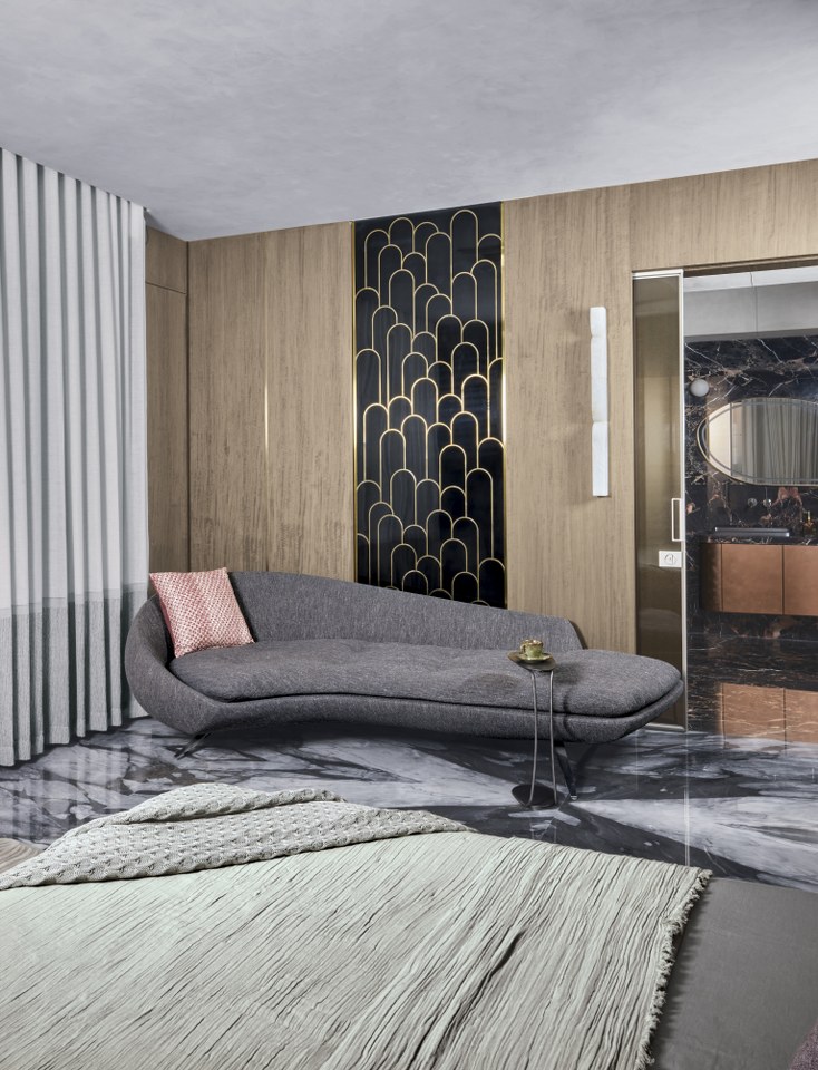 Crafted elegantly, the son’s bedroom blends youthful energy with modern design, showcasing a corrugated wooden wall paneling that bestows rich texture and visual interest, complemented by grey-toned marble flooring and a dynamic ambiance created by a lounger with grey upholstery. A metallic surface with brass inlay serves as a striking focal point behind the lounger, artfully concealing hidden storage to merge aesthetics with functionality. The attached one-of-a-kind bathroom is a luxurious celebration of marble and veneer, featuring exquisite vanity and carvings, reflecting a thoughtful layering of materials that defines understated sophistication.