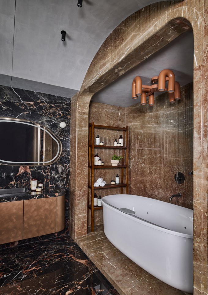 The master bath features a freestanding tub cocooned within a monolithic stone arch, a design that merges Romanesque grandeur with contemporary minimalism. The space is grounded by deep black and bronze marble flooring, with bespoke copper lighting overhead adding a warm, avant-garde glow.