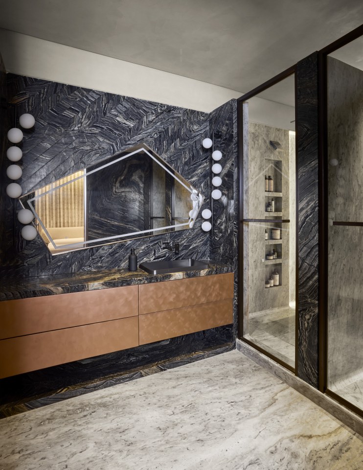 Another bath plays with geometry and rhythm: an angular mirror framed by twin rows of globe lights sits against a backdrop of chevron-patterned black stone. The floating vanity in hammered copper brings warmth and movement, contrasting beautifully against the raw texture of the walls and floors.
